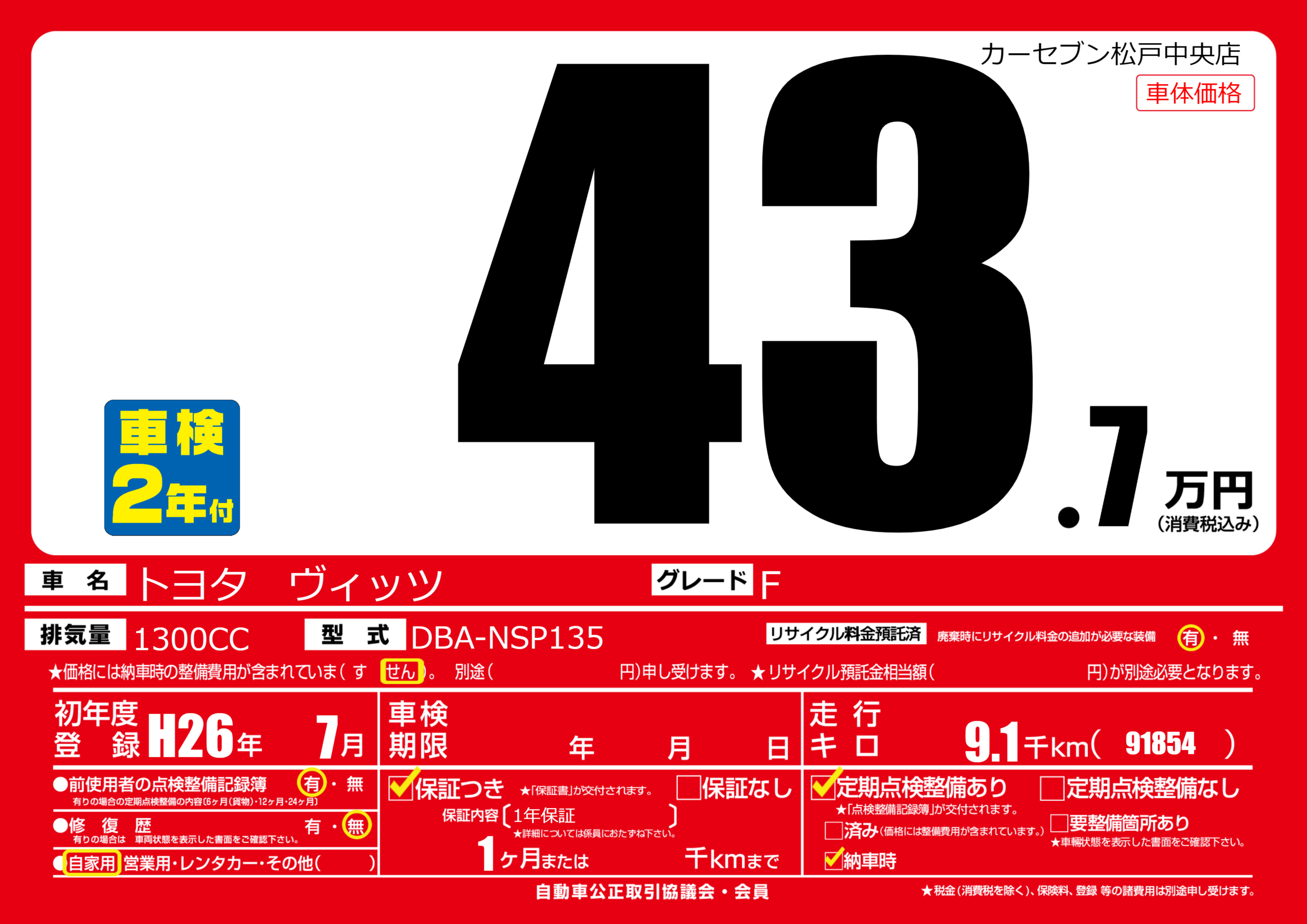 | 車名 | トヨタ ヴィッツ | グレード ミッション 排気量 |
