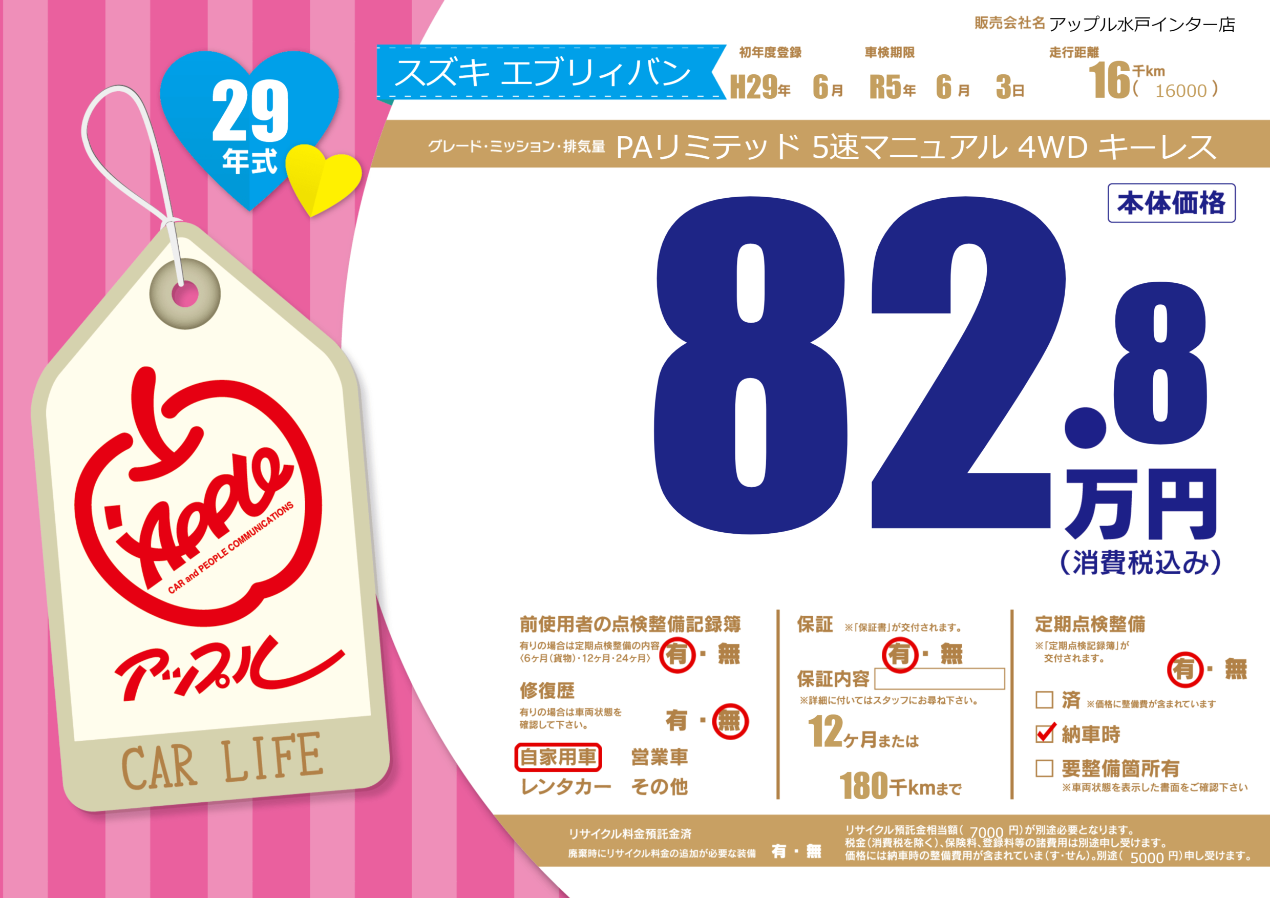 | 車名 | スズキ エブリィバン | グレード ミッション 排気量 |