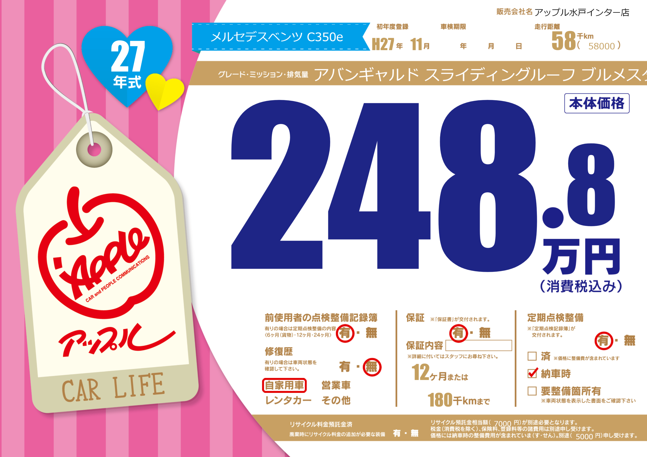 | 車名 | メルセデスベンツ C350e | グレード ミッション 排気量 |