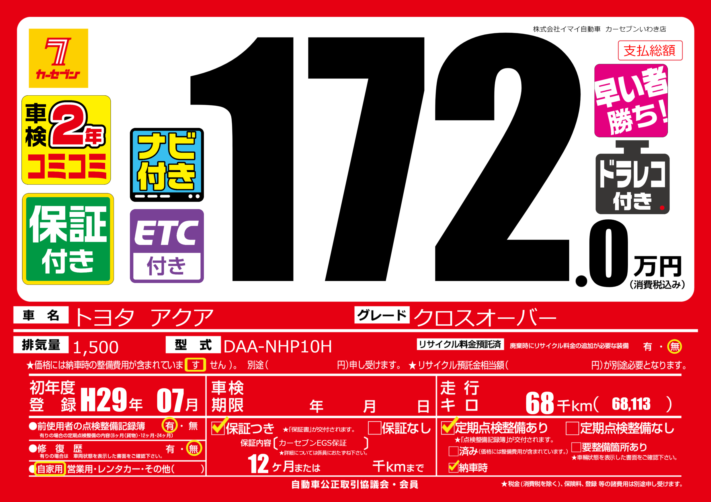 | 走行キロ | 6.8万km | 初年度登録 | H29年07月 |