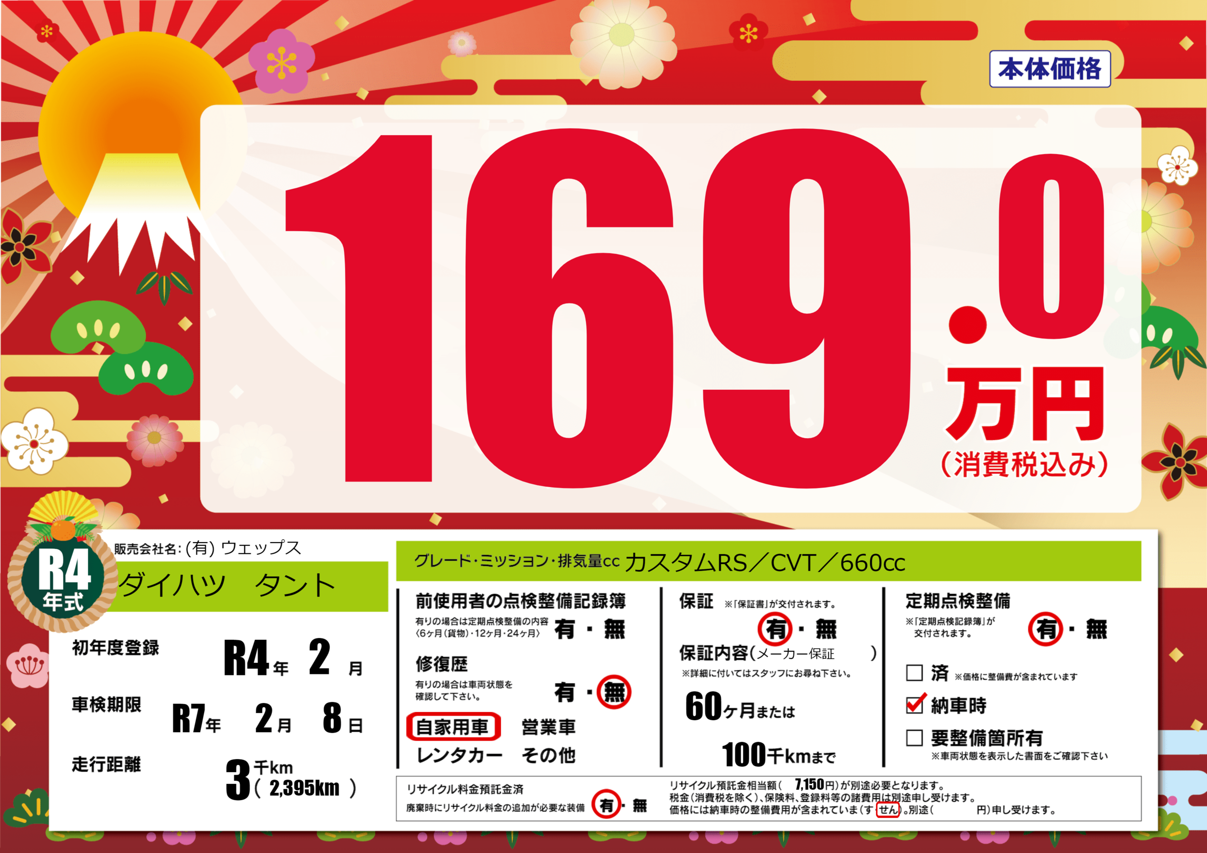 | 車名 | ダイハツ タント | グレード ミッション 排気量 |
