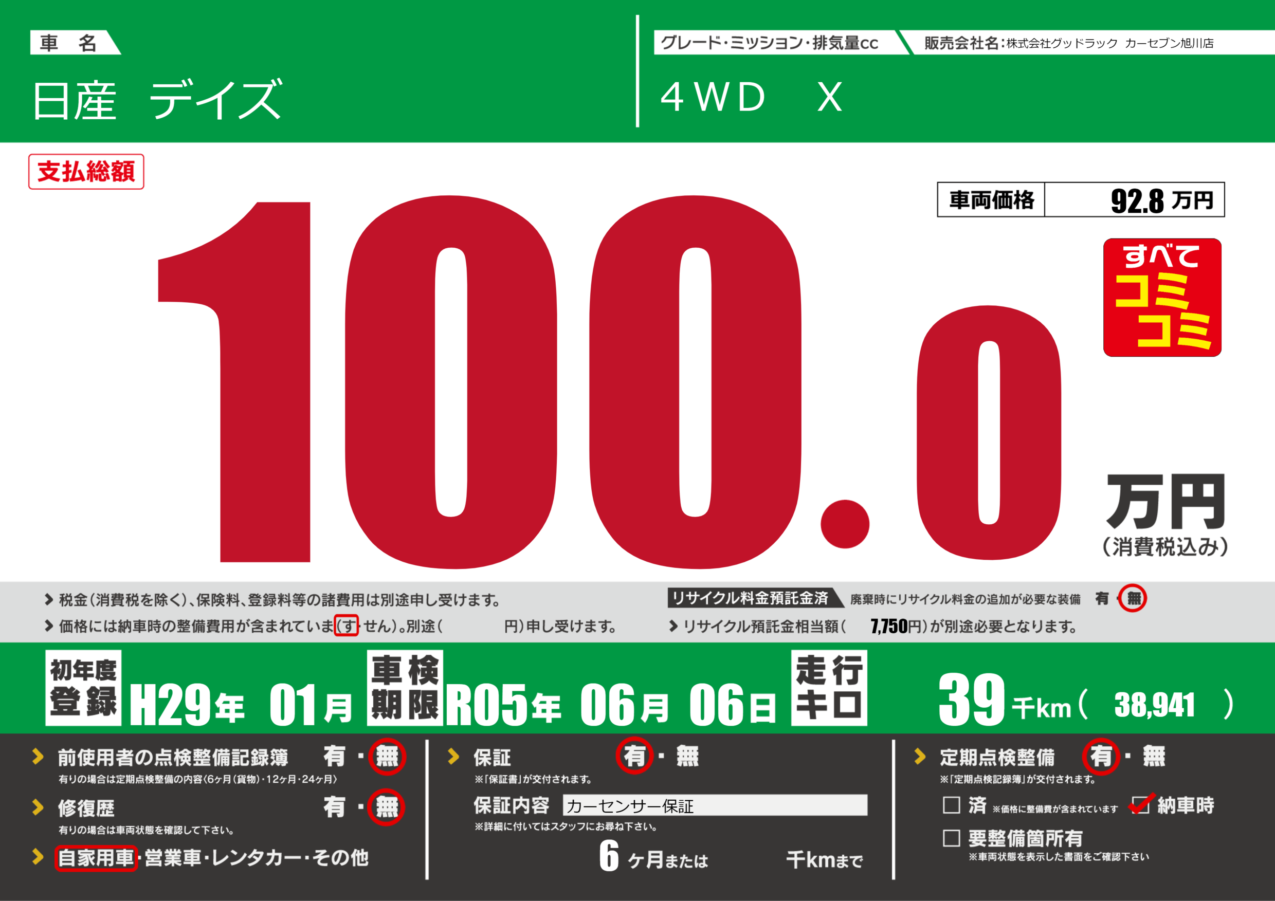 | 走行キロ | 3.9万km | 初年度登録 | H29年01月 |
