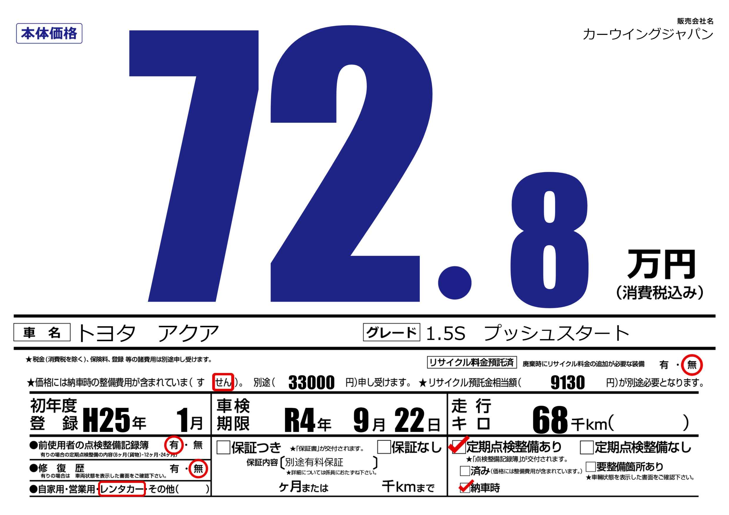 | 定期点検整備 | 定期点検整備あり 納車時あり | ||