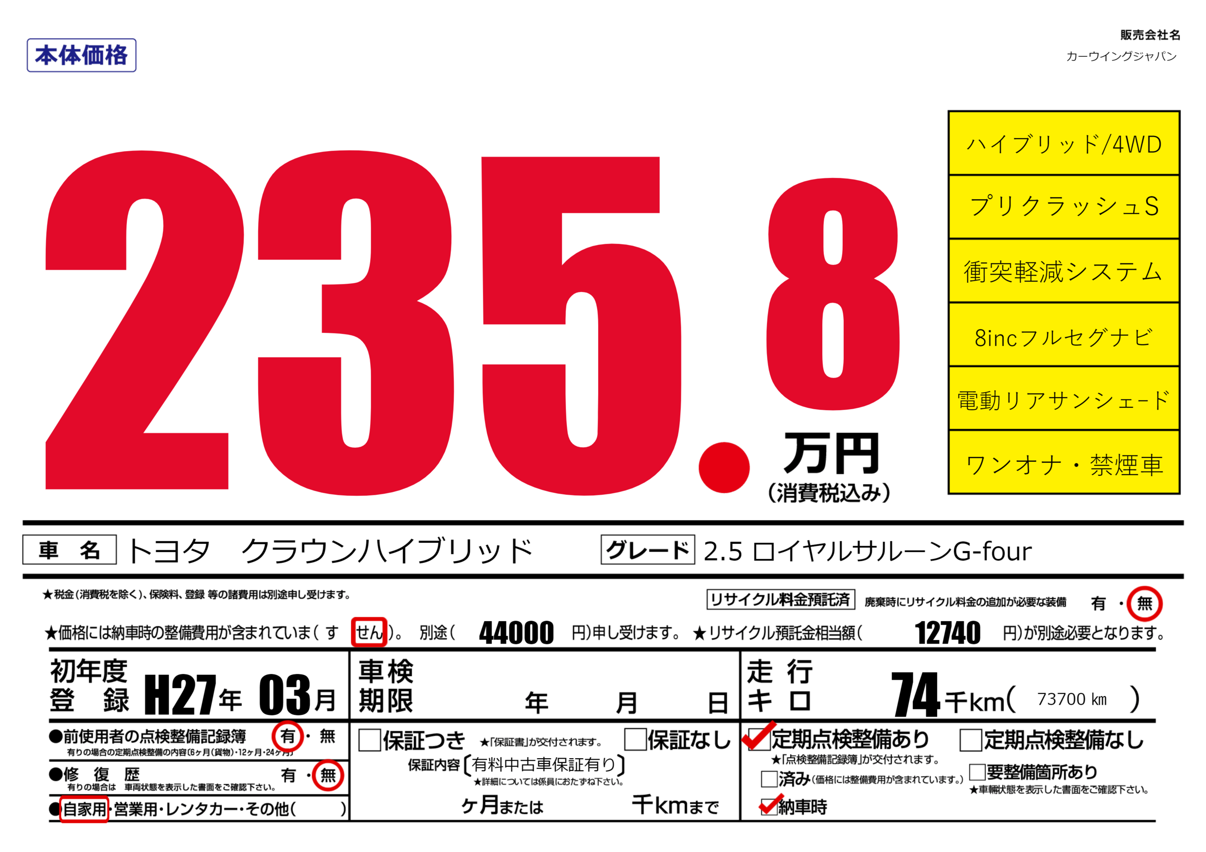 保証なし 保証内容(有料中古車保証有り) ---ヶ月または()千kmまで |