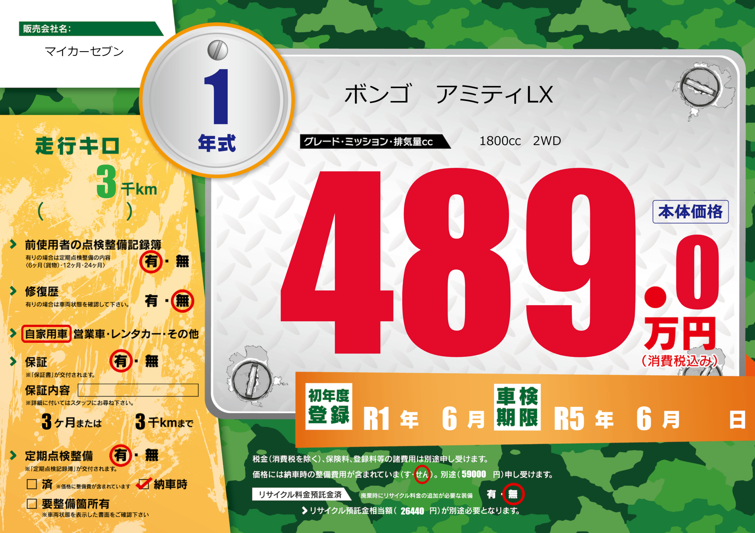 | 車名 | ボンゴ アミティLX | グレード ミッション 排気量 |