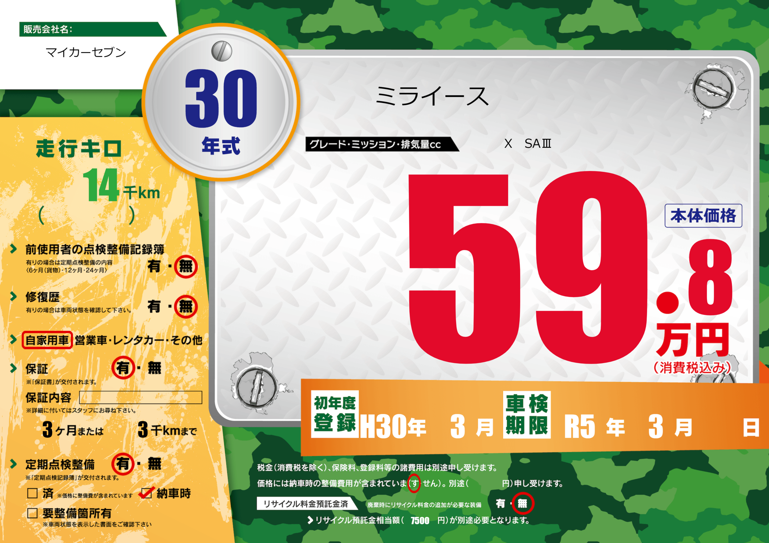 保証付き 保証内容(---) 3ヶ月または(3)千kmまで |