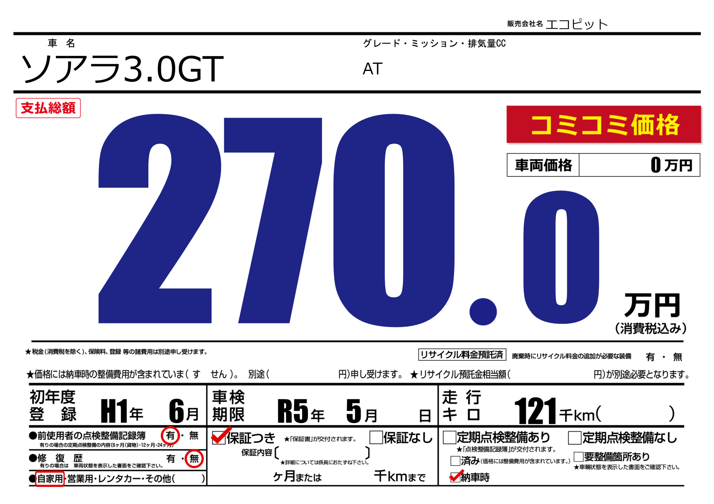| 車名 | ソアラ3.0GT | グレード ミッション 排気量 |