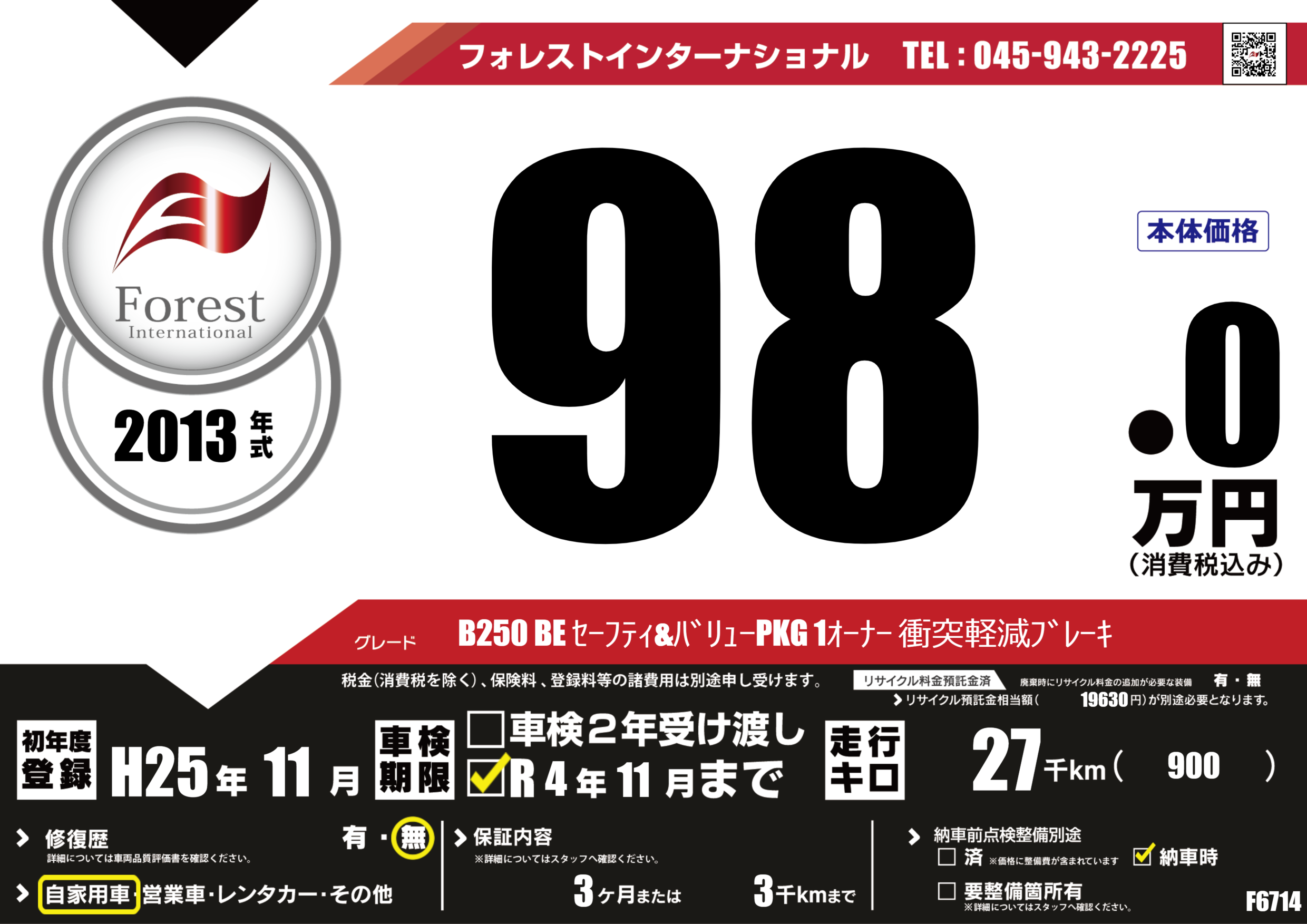 | 走行キロ | 2.7万km | 初年度登録 | H25年11月 |