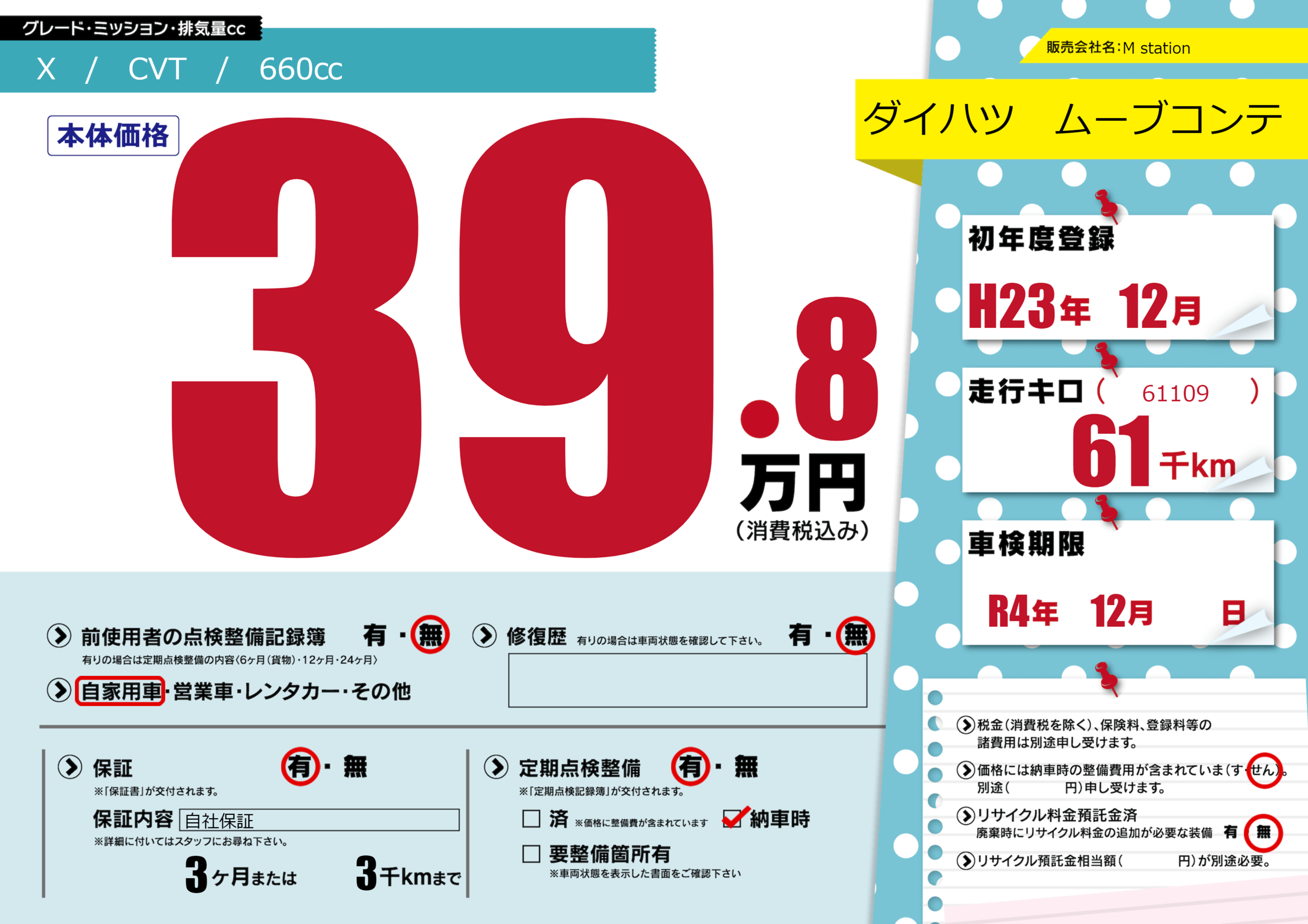 なし | 車検制限 | R4年12月---月 |