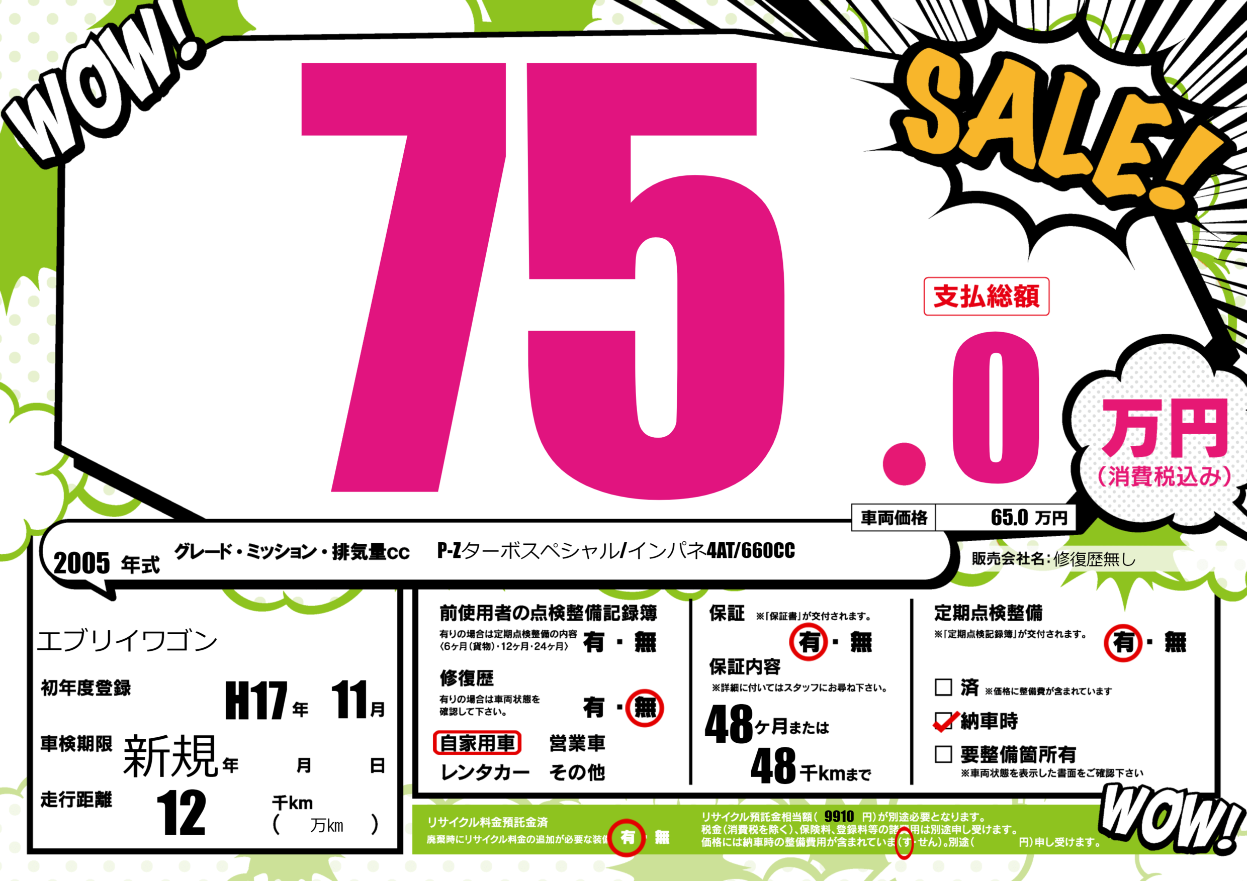 | 車名 | エブリイワゴン | グレード ミッション 排気量 |