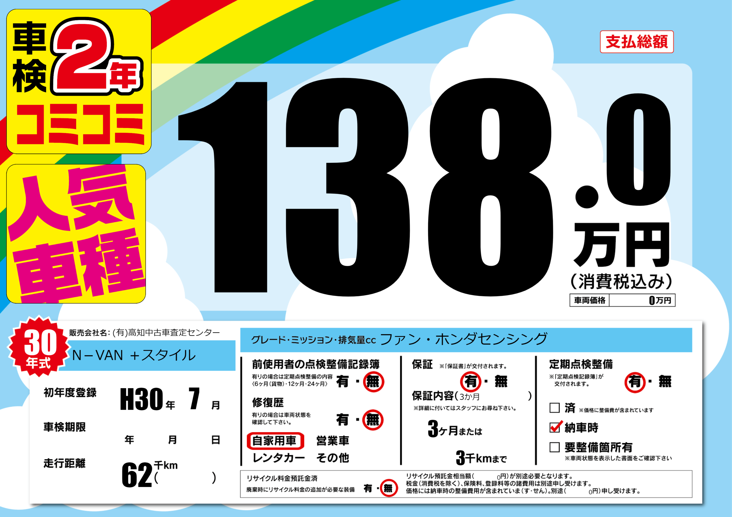 | 走行キロ | 6.2万km | 初年度登録 | H30年7月 |