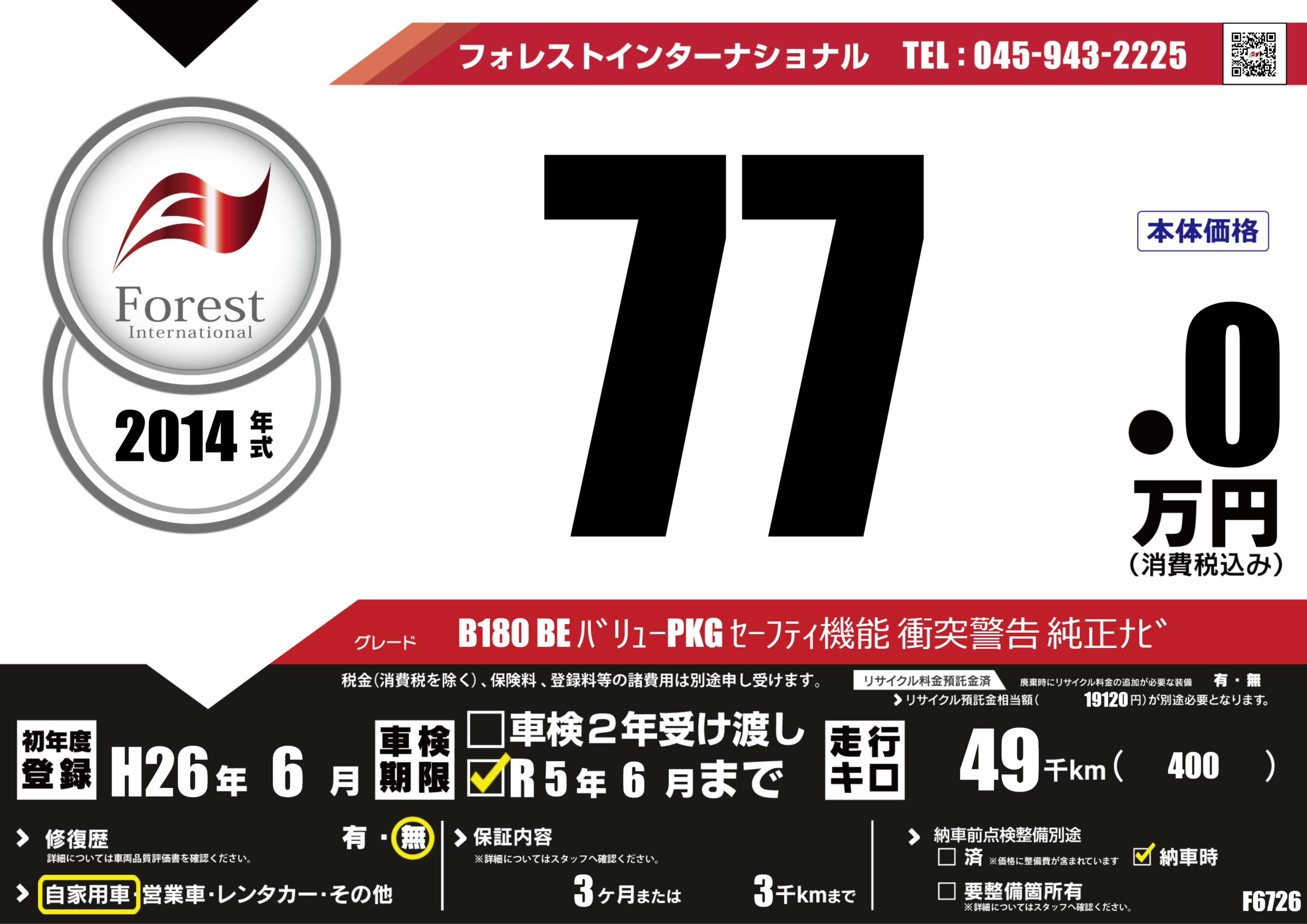 B180 BE バリューPKG セーフティ機能 衝突警告 純正ナビ |