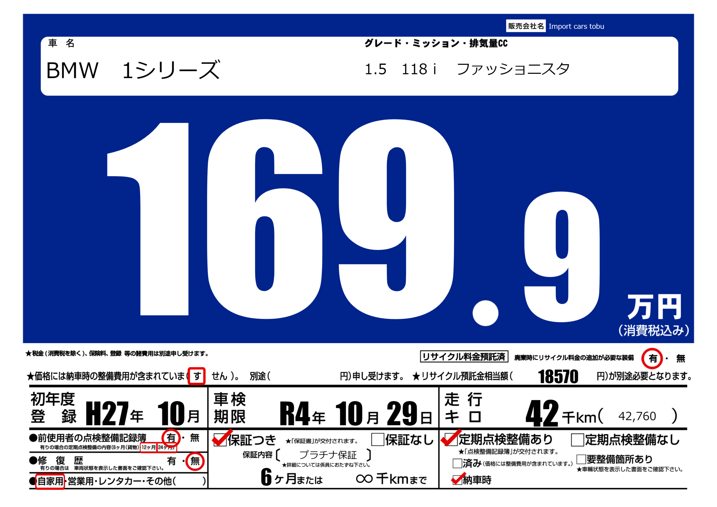 保証付き 保証内容( プラチナ保証) 6ヶ月または(∞)千kmまで |