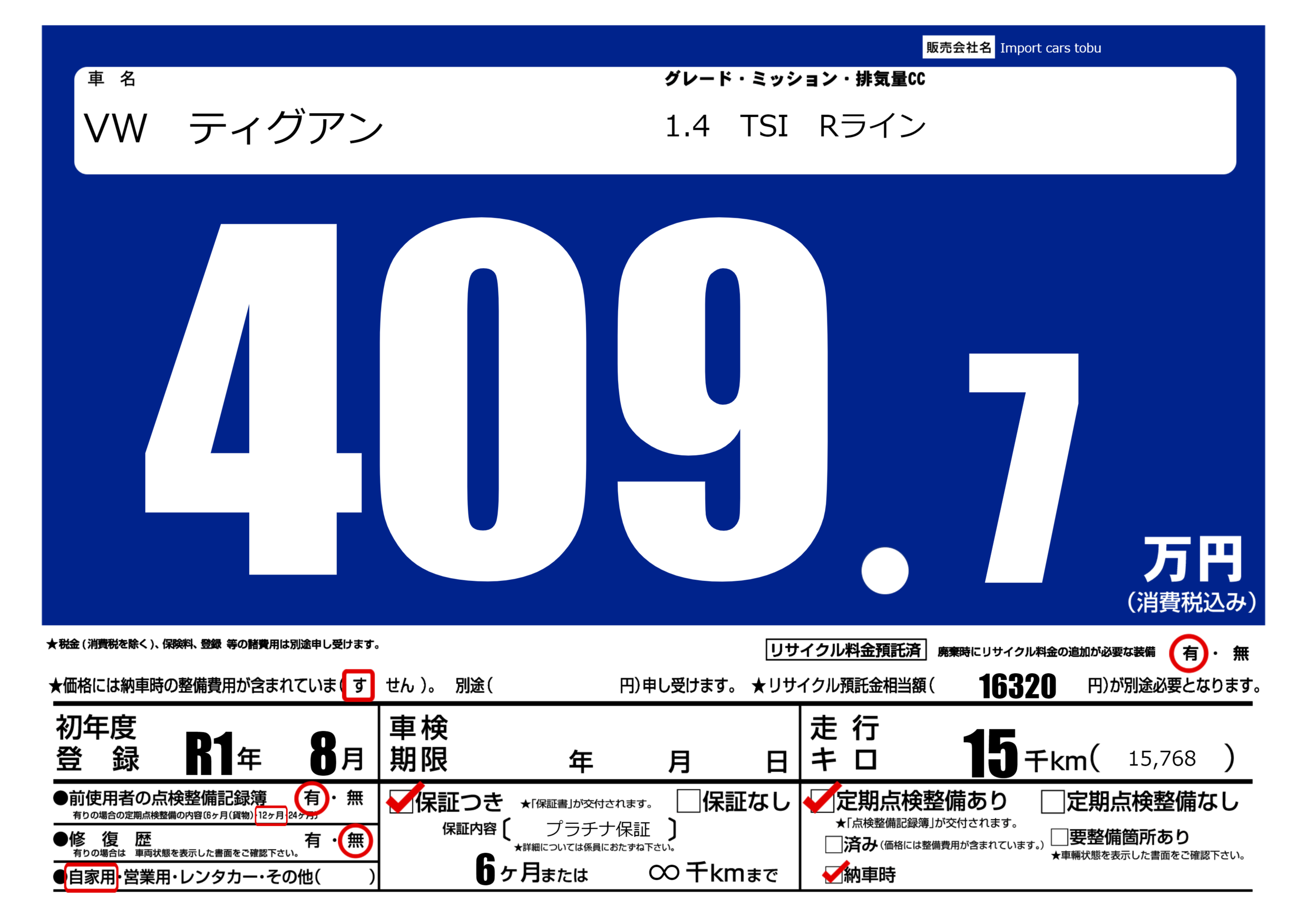 保証付き 保証内容( プラチナ保証) 6ヶ月または(∞)千kmまで |
