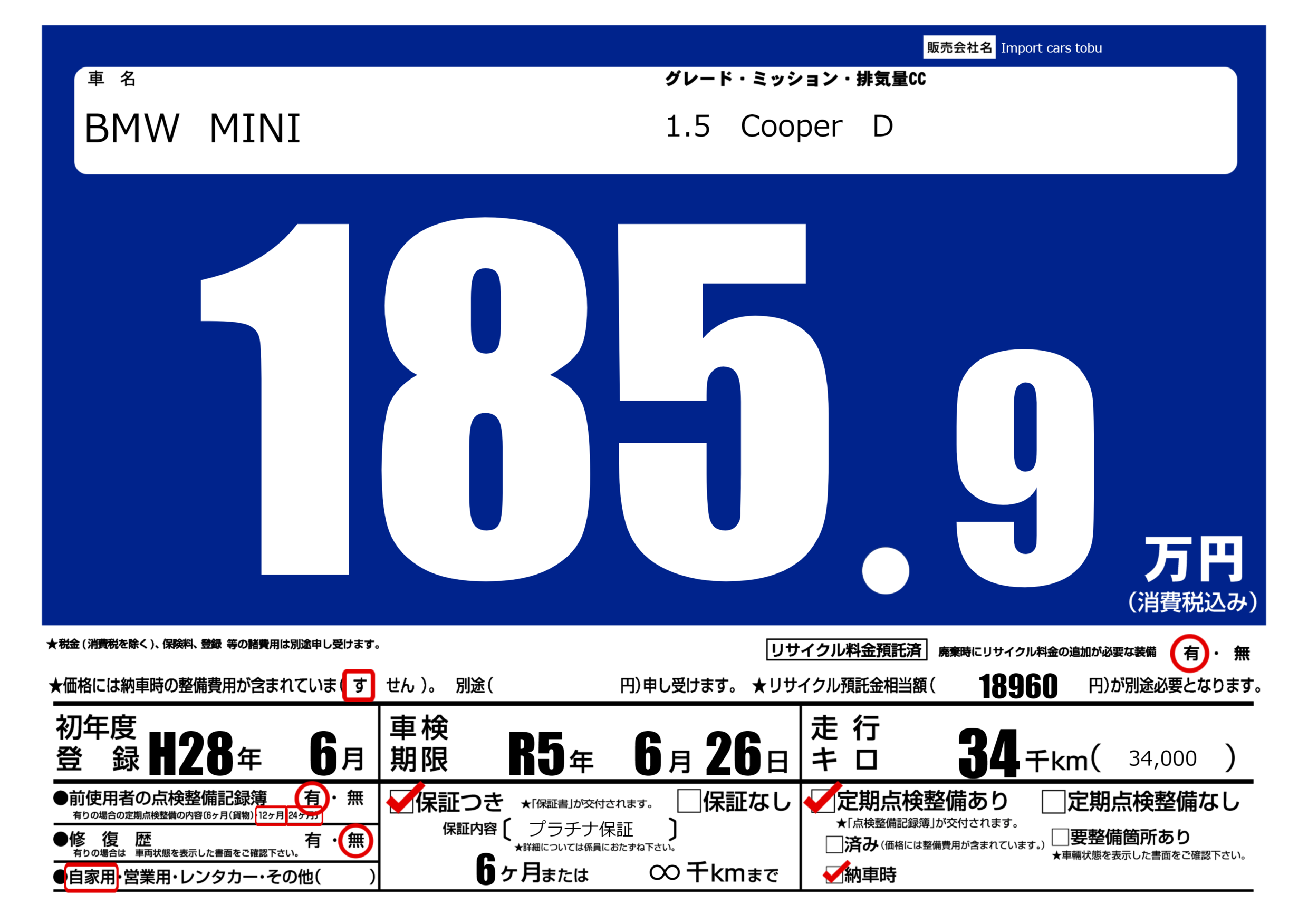 保証付き 保証内容( プラチナ保証) 6ヶ月または(∞)千kmまで |