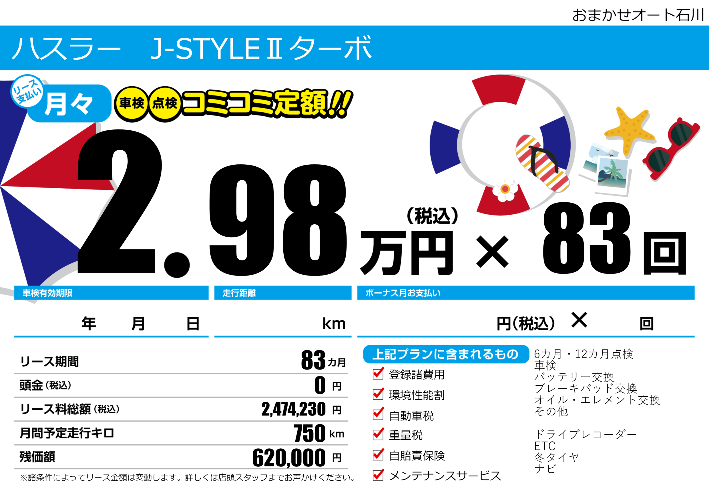 | 車名 | ハスラー J-STYLEⅡターボ | グレード ミッション 排気量 |