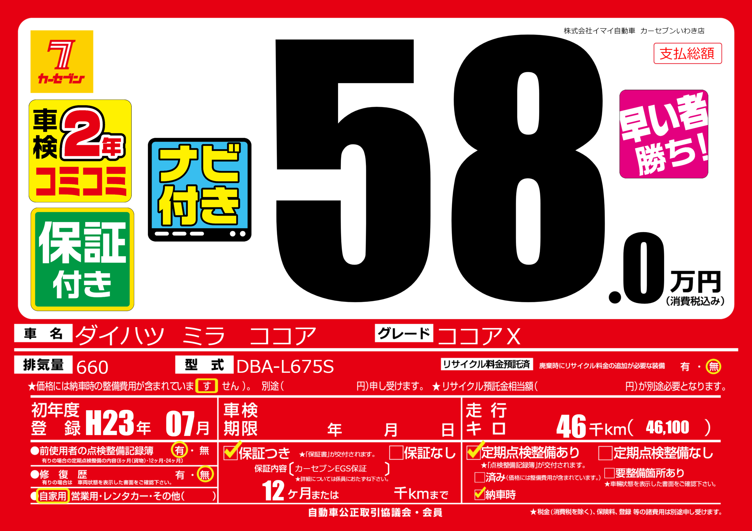 | 走行キロ | 4.6万km | 初年度登録 | H23年07月 |