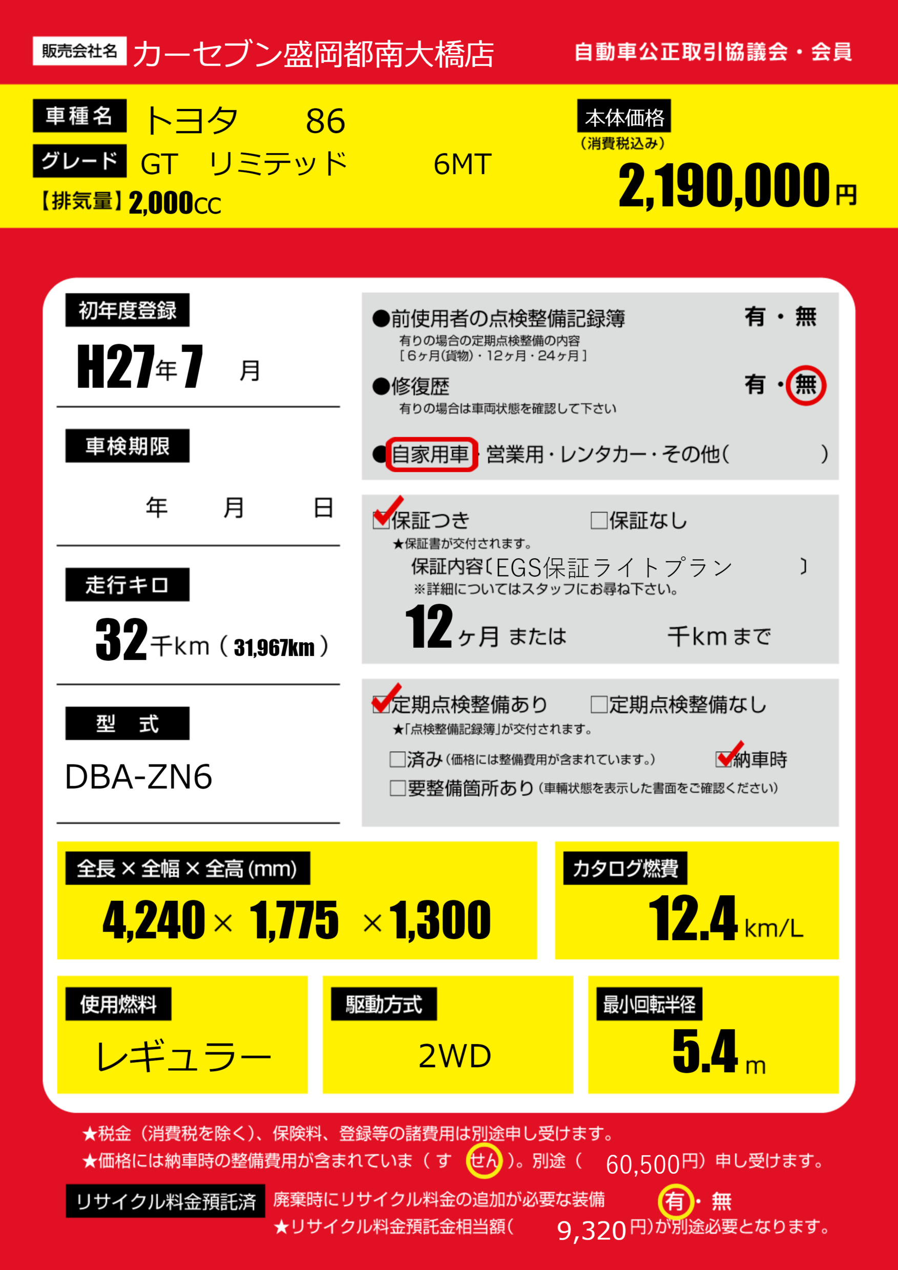 | 車名 | トヨタ 86 | グレード ミッション 排気量 |