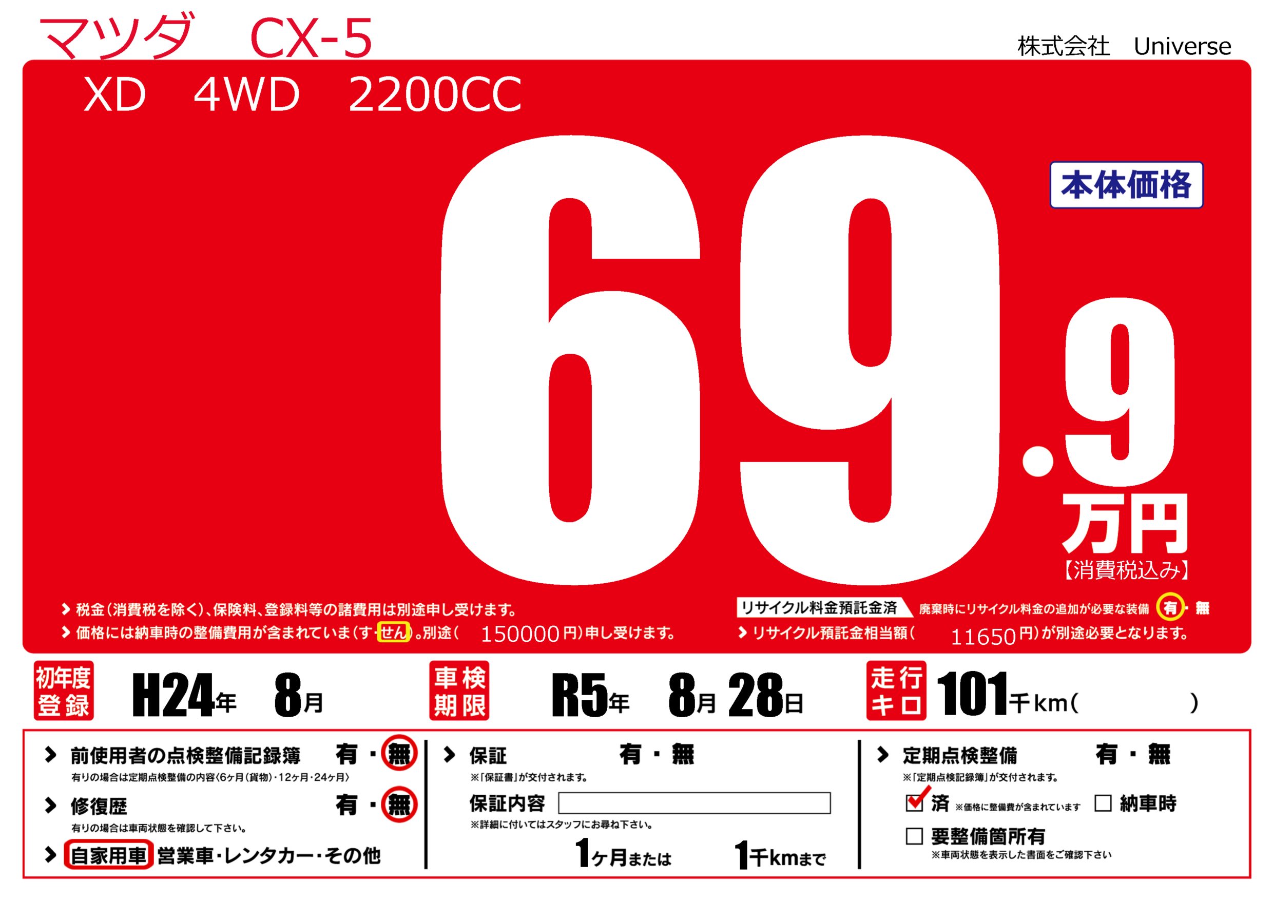 | 車名 | マツダ CX-5 | グレード ミッション 排気量 |