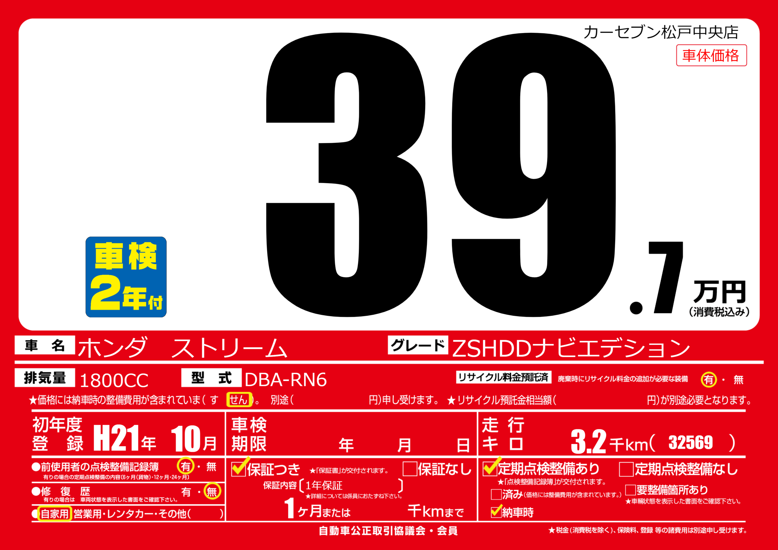 | 車名 | ホンダ ストリーム | グレード ミッション 排気量 |