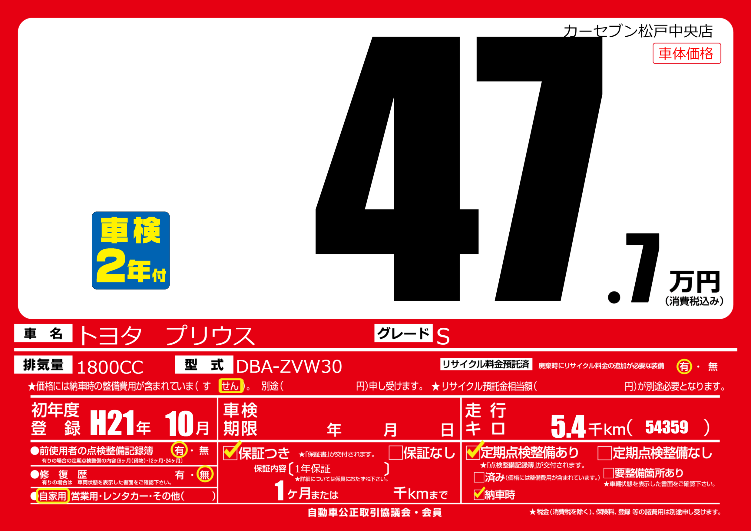 | 車名 | トヨタ プリウス | グレード ミッション 排気量 |