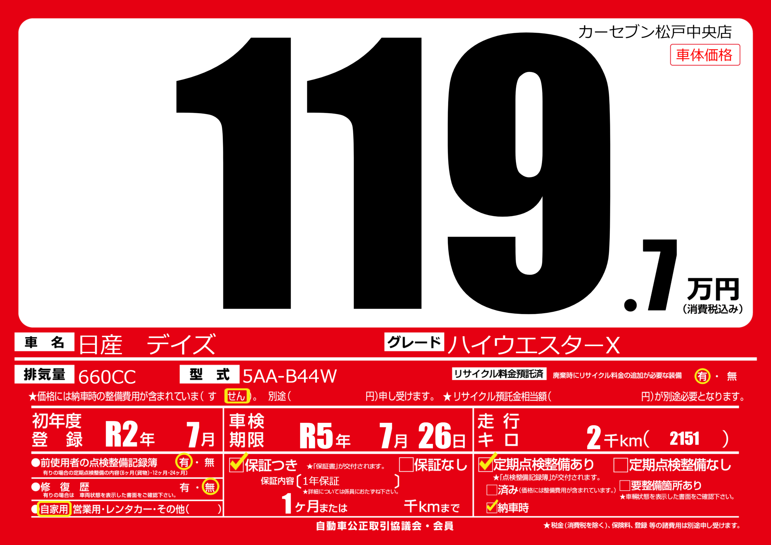 | 車名 | 日産 デイズ | グレード ミッション 排気量 |