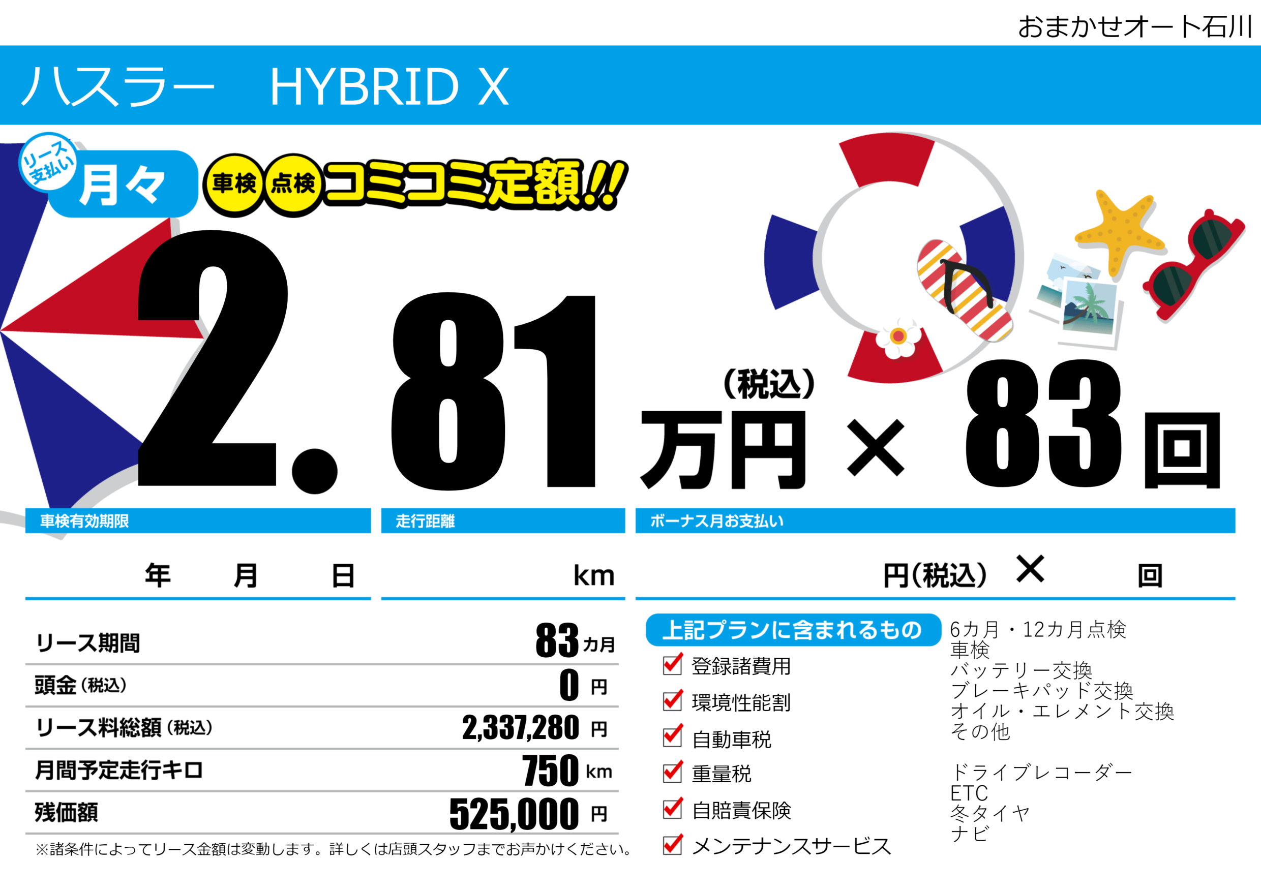 | 車名 | ハスラー HYBRID X | グレード ミッション 排気量 |