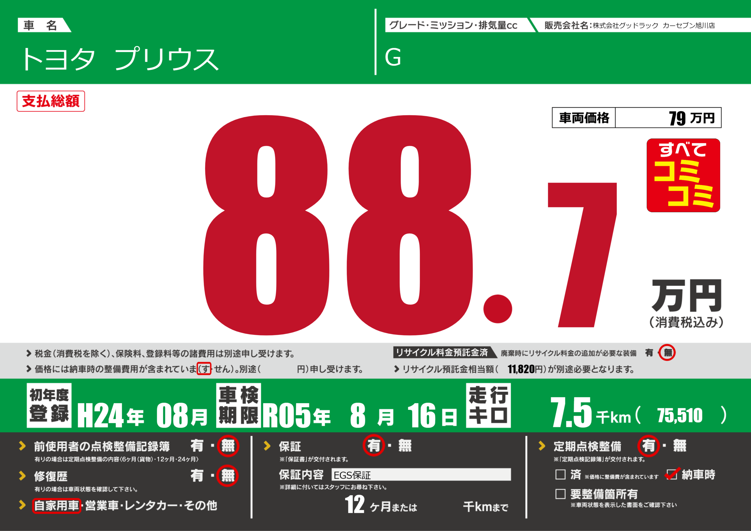 保証付き 保証内容(EGS保証) 12ヶ月または千km |