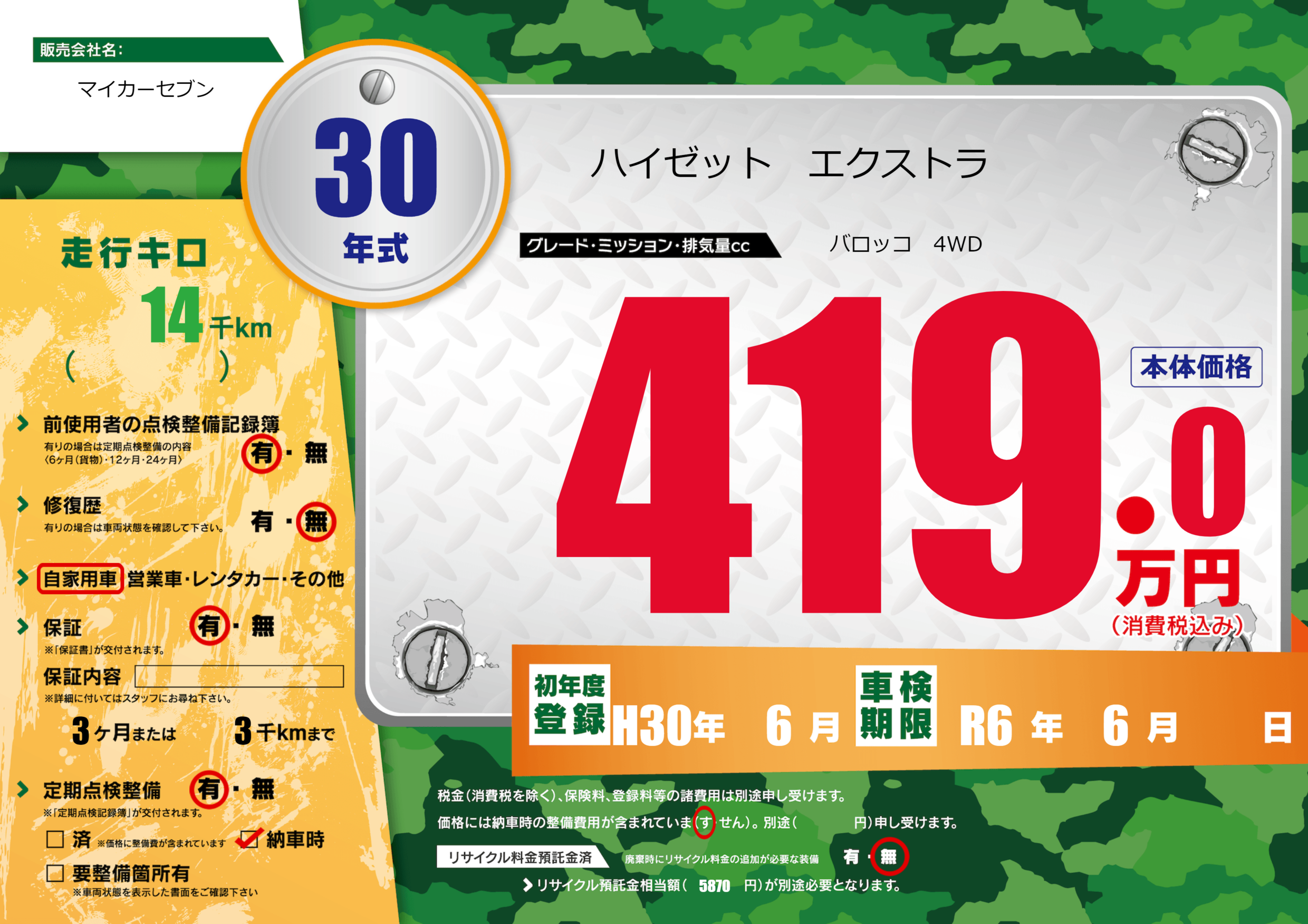 | 車検制限 | R6年 6月 - 日 | ||