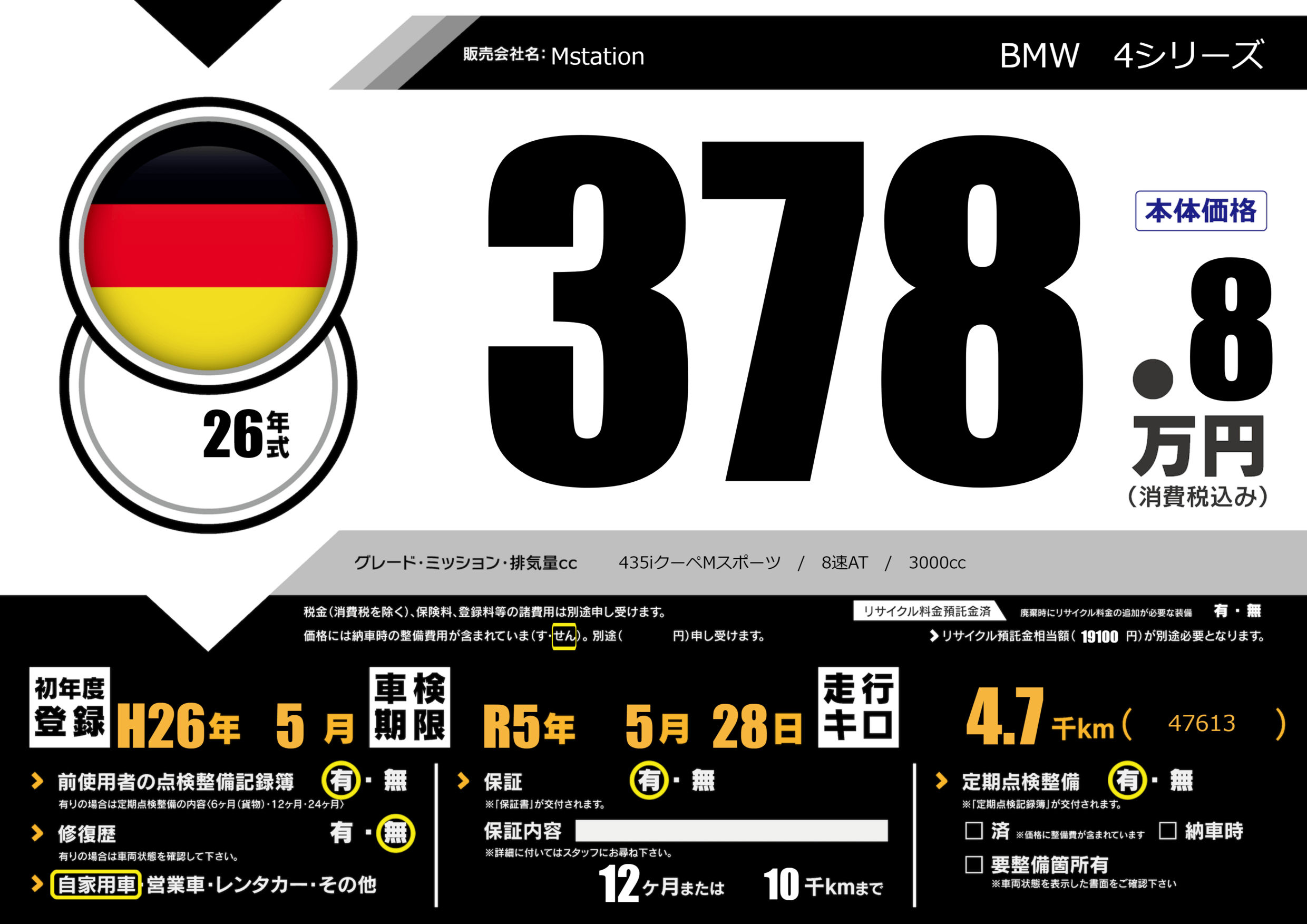 | 車名 | BMW 4シリーズ | グレード ミッション 排気量 |