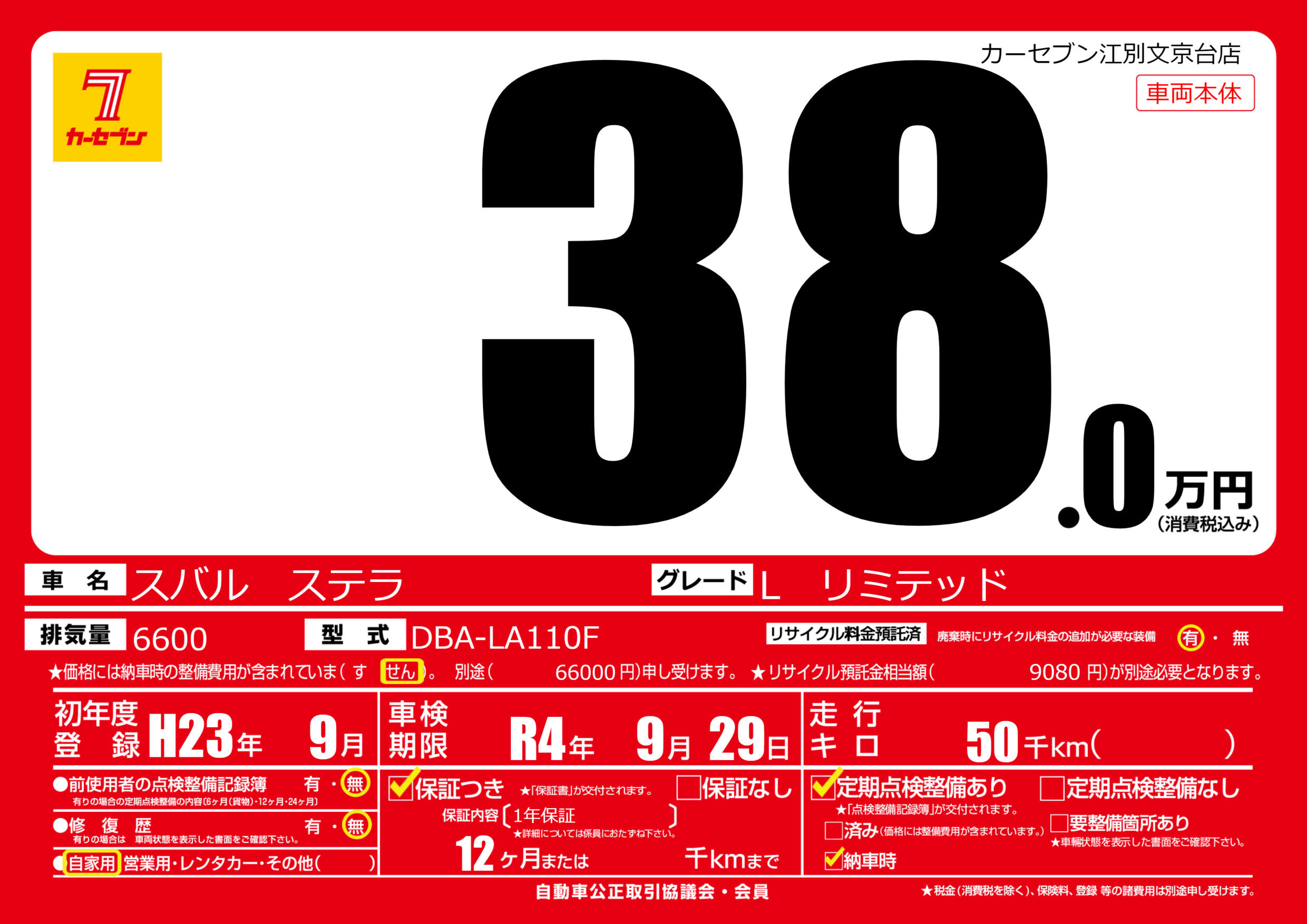 | 車名 | スバル ステラ | グレード ミッション 排気量 |