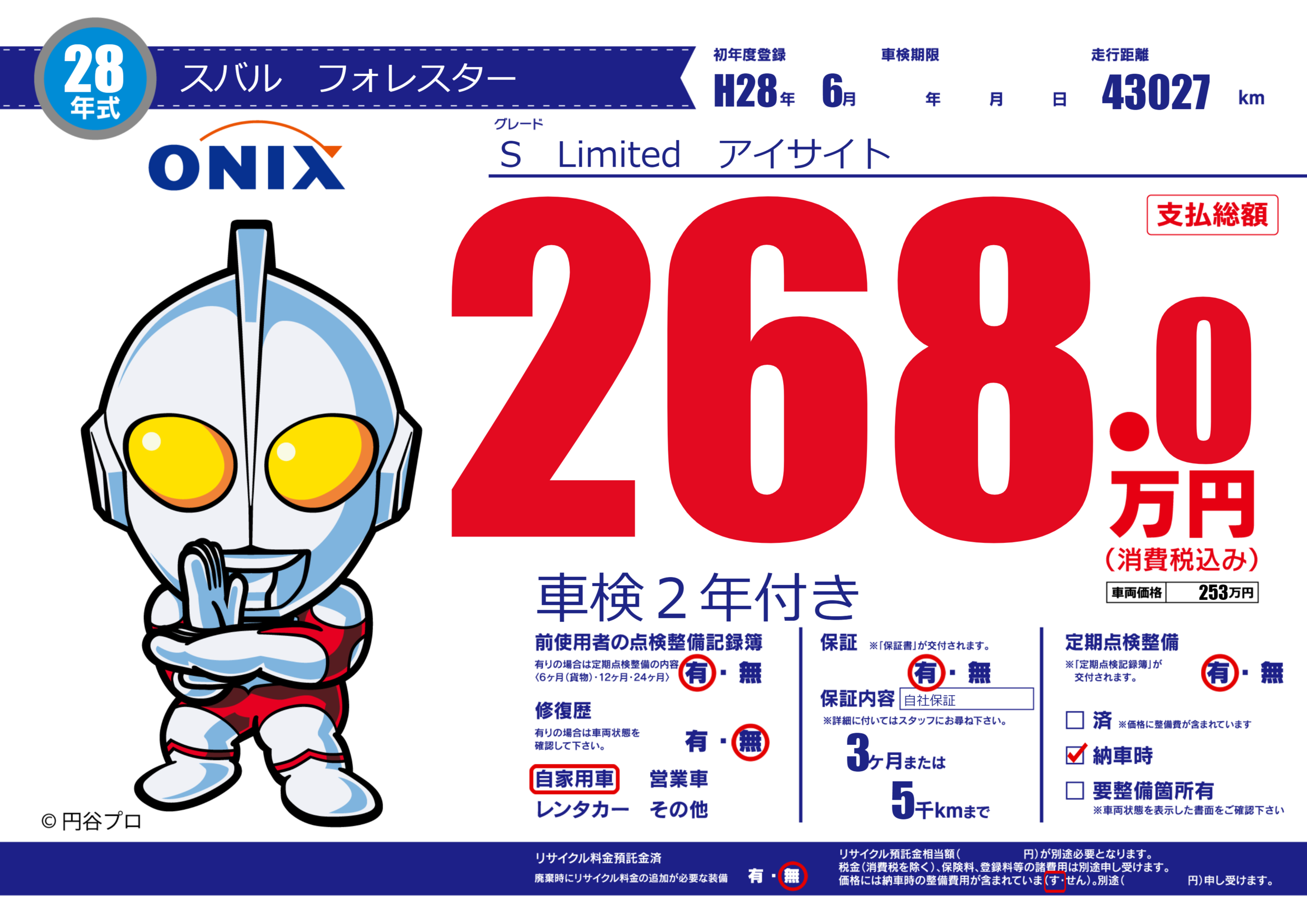 | 走行キロ | 4302.7万km | 初年度登録 | H28年6月 |