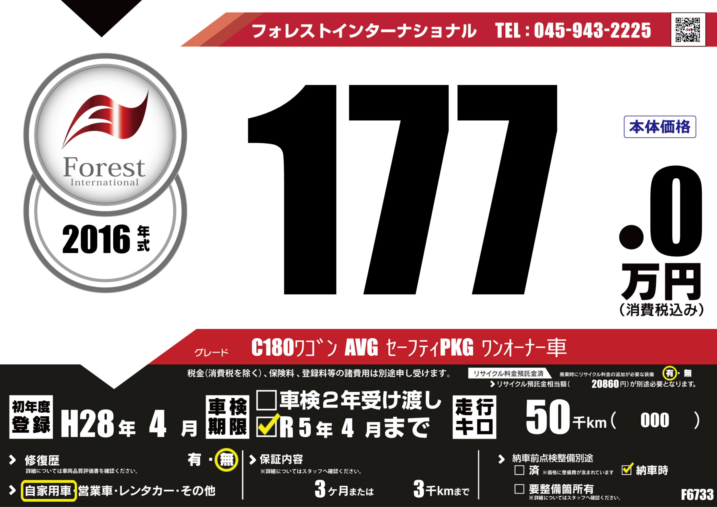 | 走行キロ | 5万km | 初年度登録 | H28年4月 |