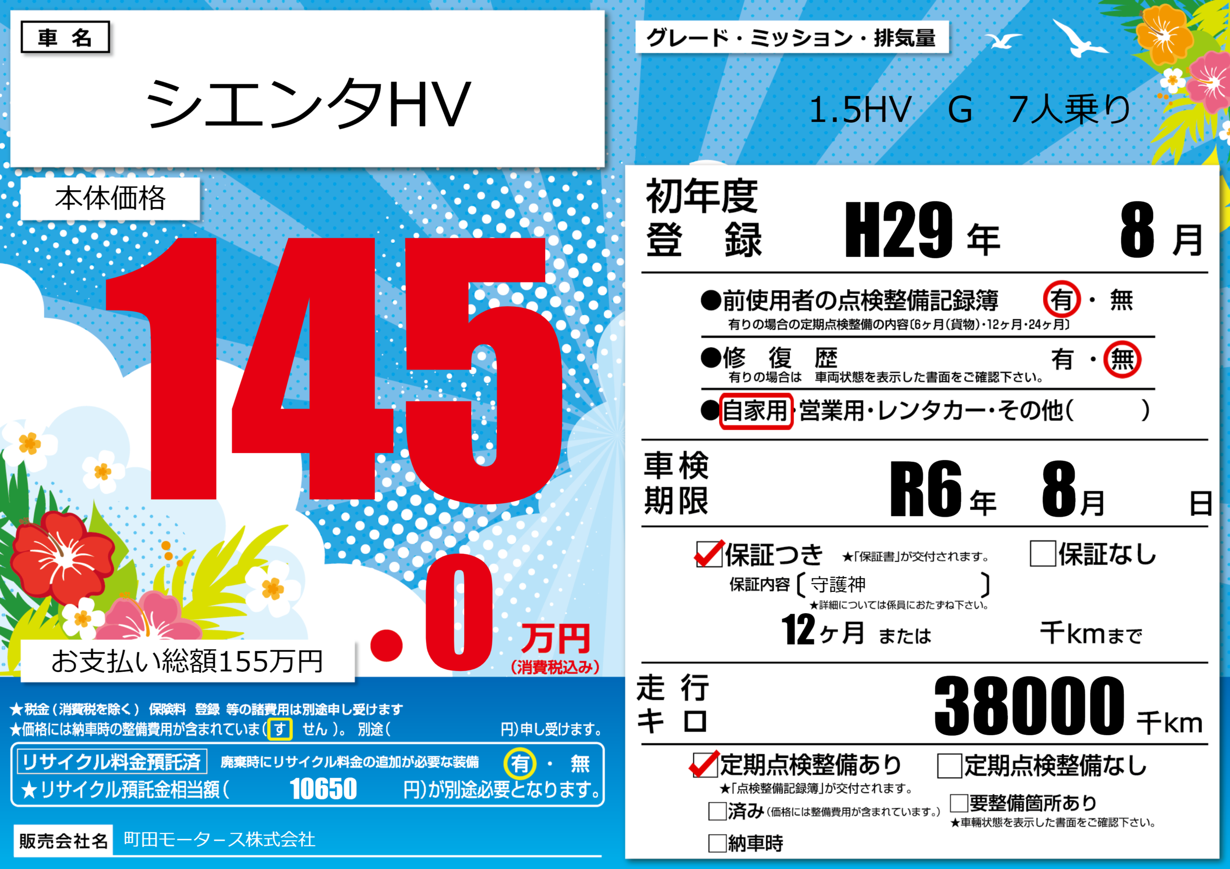 | 車名 | シエンタHV | グレード ミッション 排気量 |