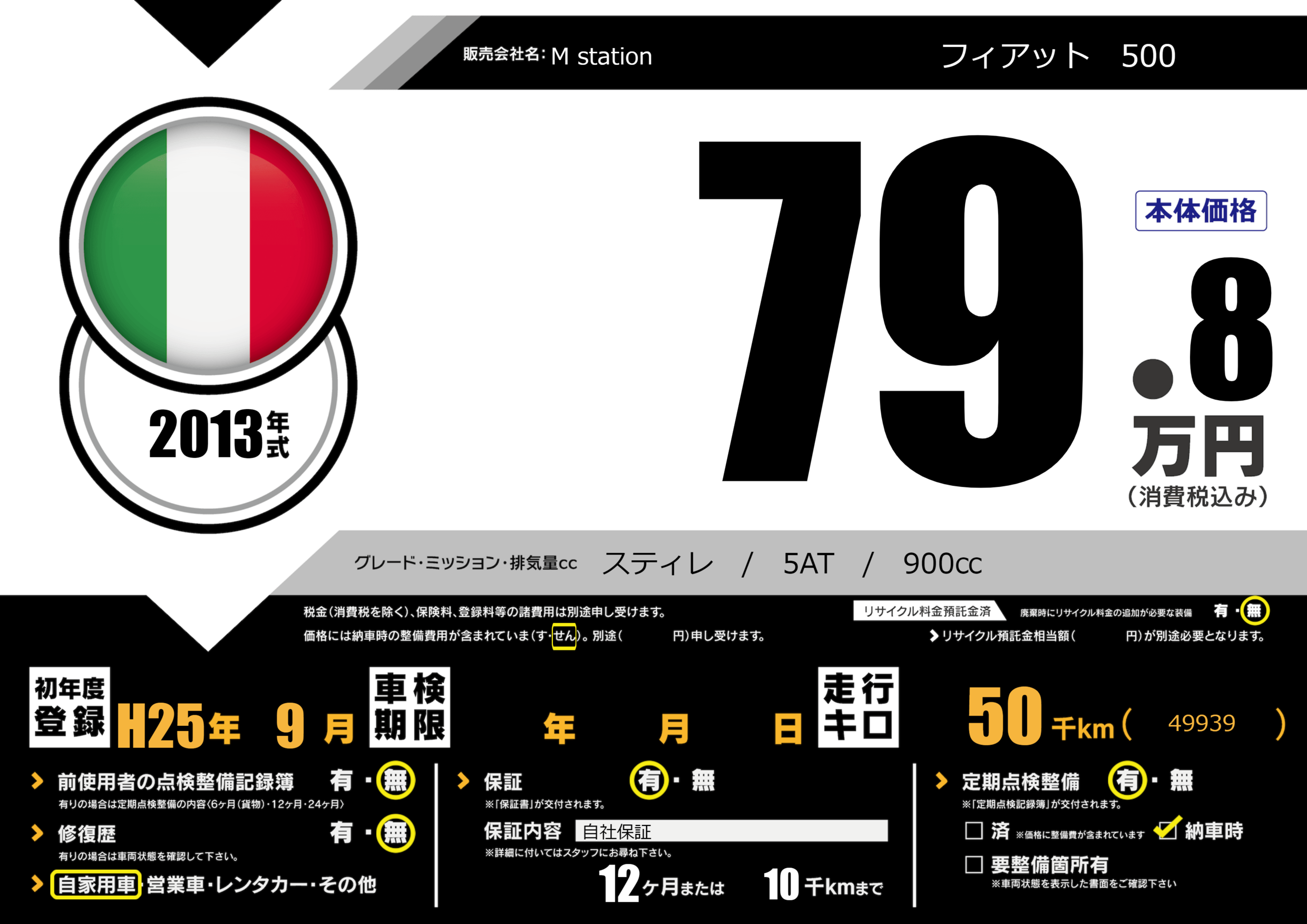 | 車名 | フィアット 500 | グレード ミッション 排気量 |