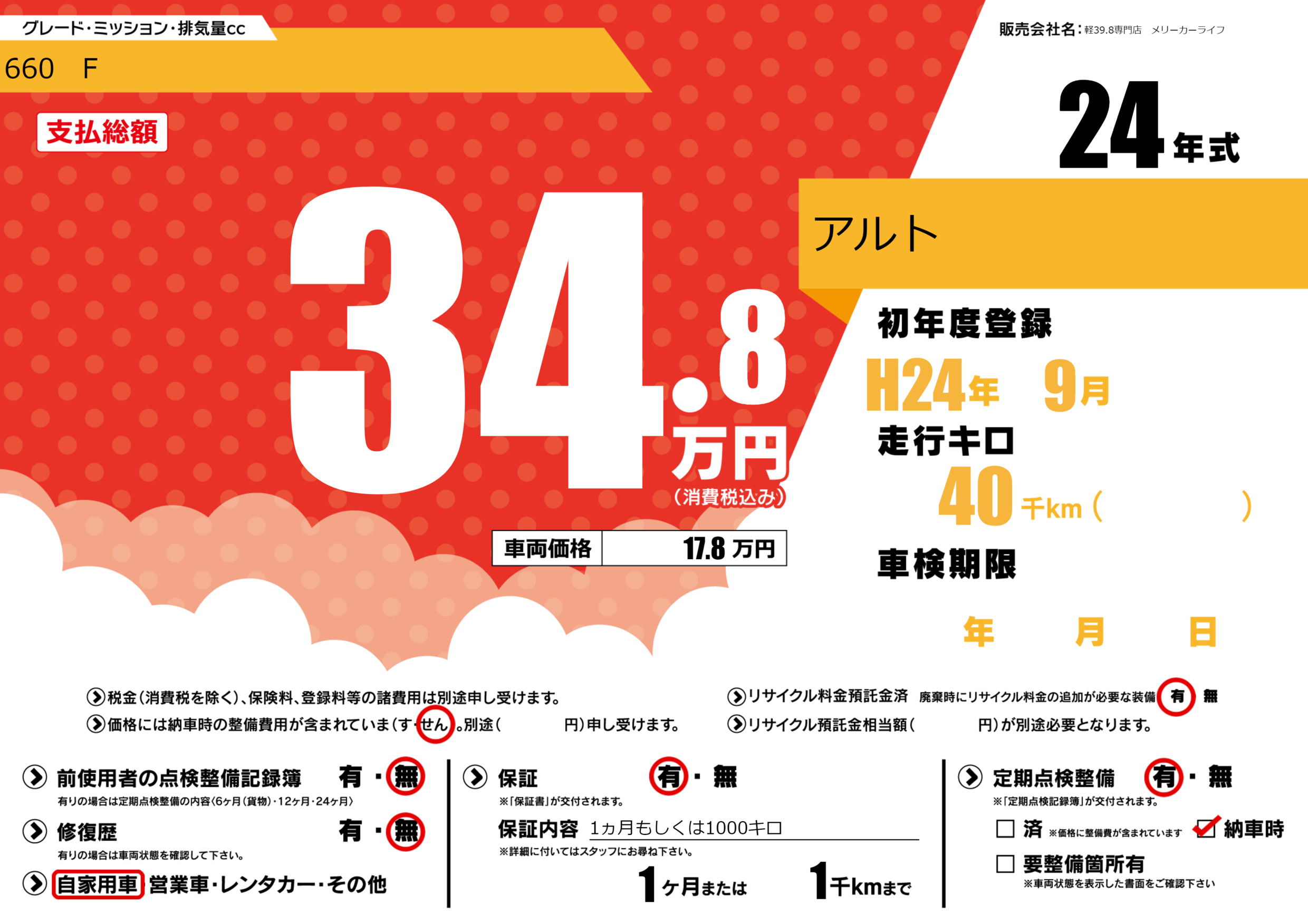 | 定期点検整備 | 定期点検整備あり 納車時あり | ||