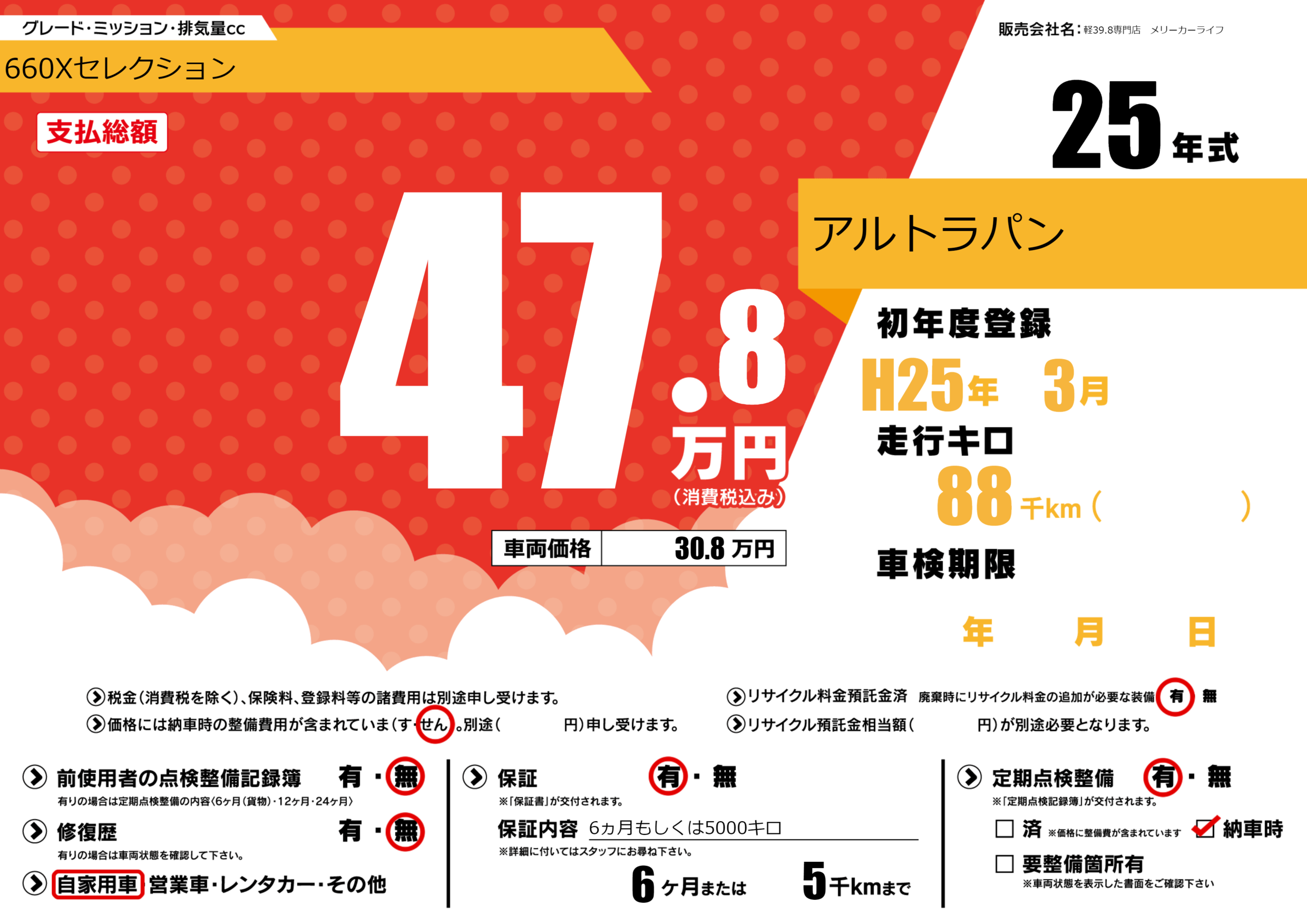 保証付き 保証内容(6ヵ月もしくは5000キロ) 6ヶ月または(5)千kmまで |