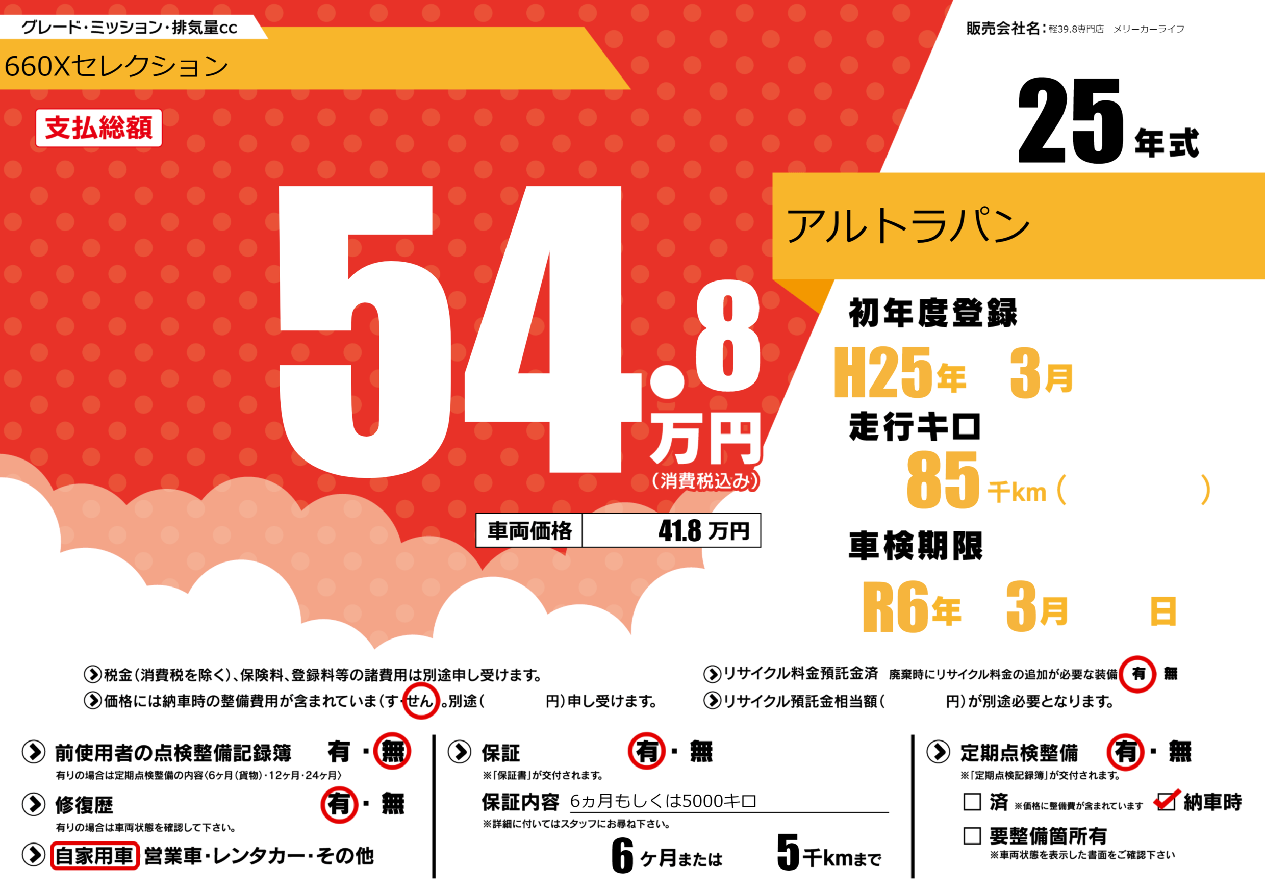 | 定期点検整備 | 定期点検整備あり 納車時あり | ||