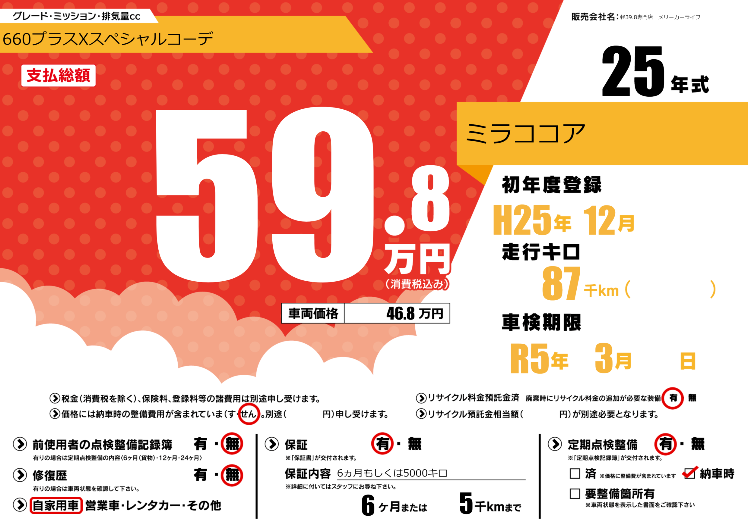 | 車名 | ミラココア | グレード ミッション 排気量 |
