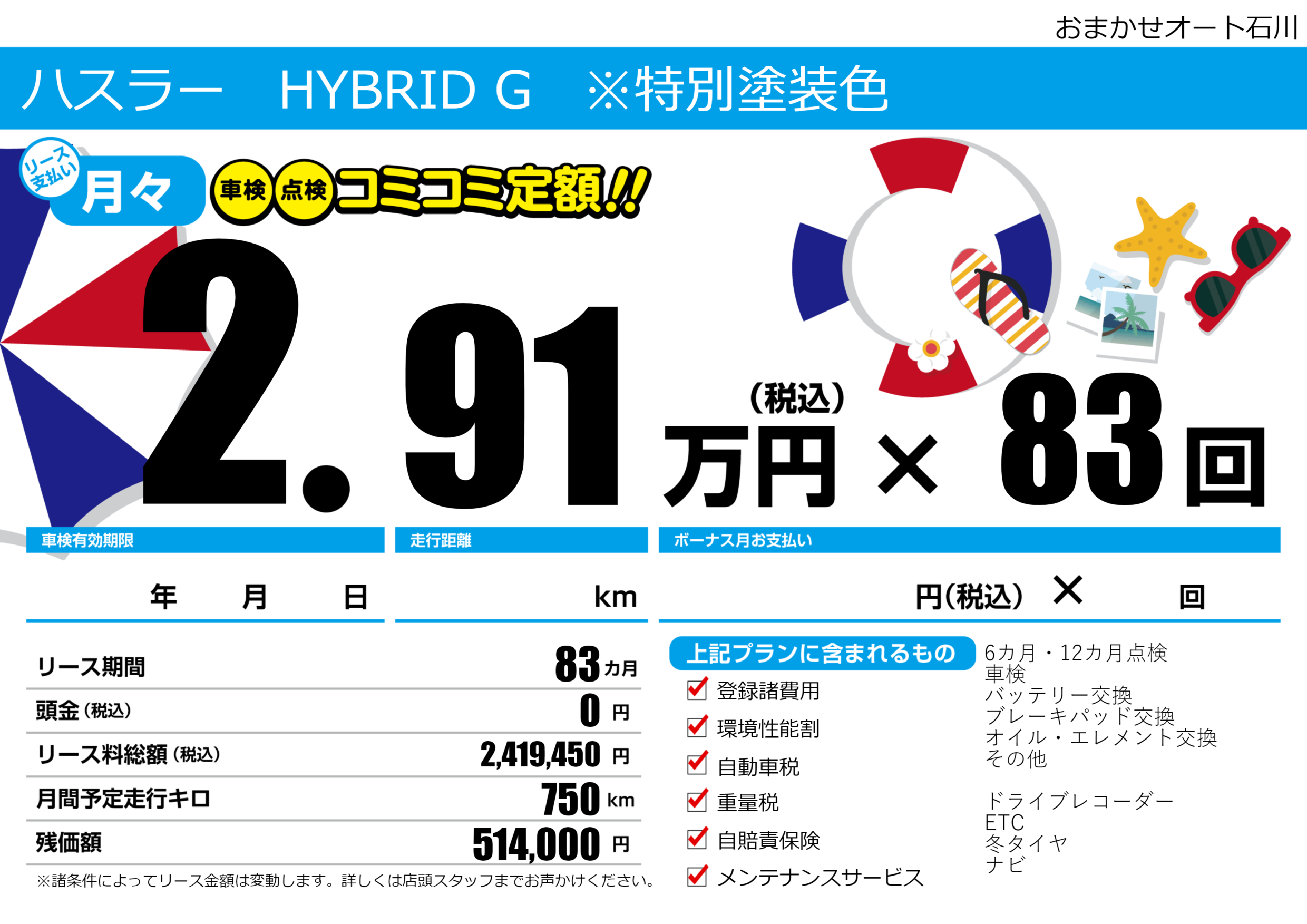 | 車名 | ハスラー HYBRID G ※特別塗装色 | グレード ミッション 排気量 |