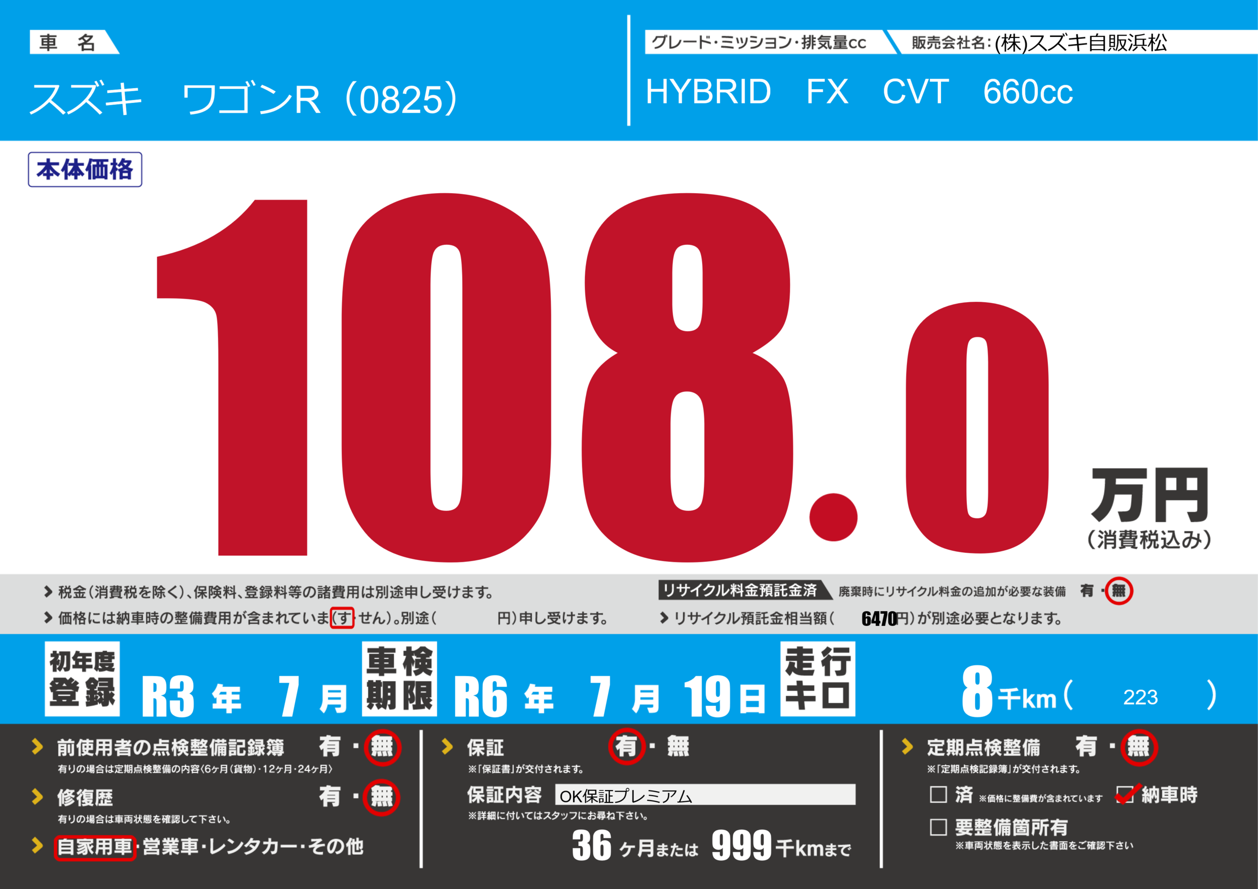 | 車名 | スズキ ワゴンR(0825) | グレード ミッション 排気量 |
