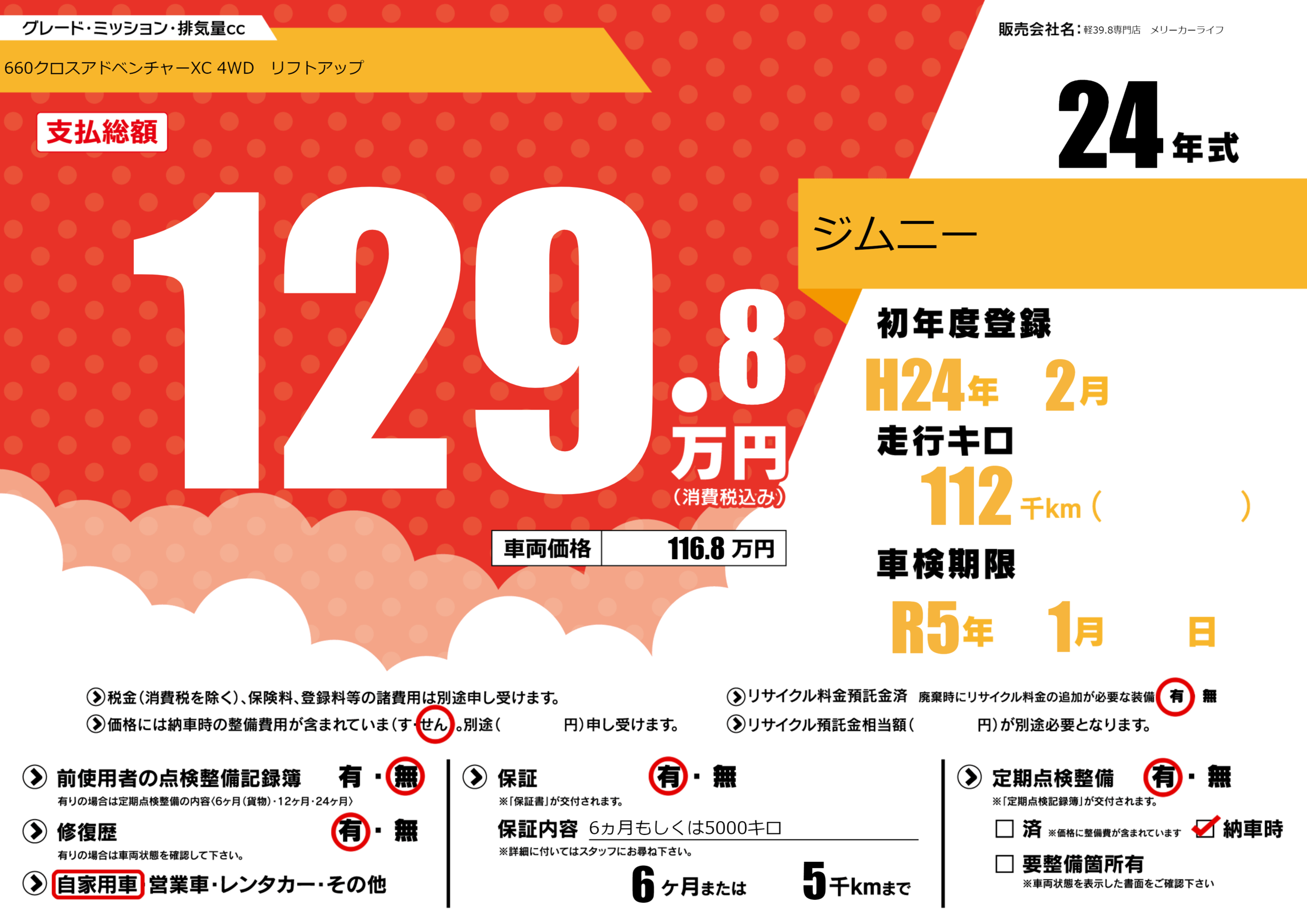 | 車名 | ジムニー | グレード ミッション 排気量 |