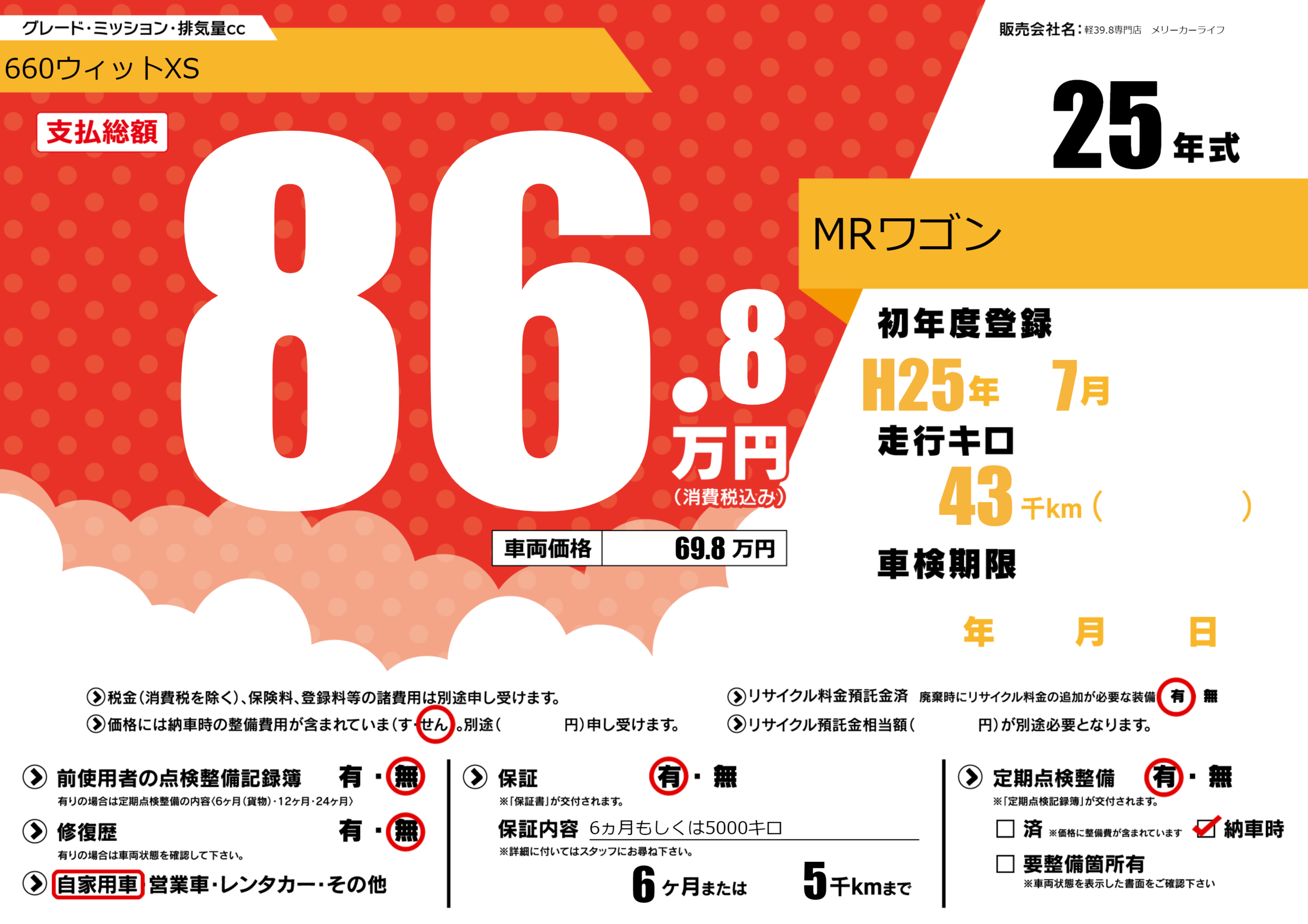 | 車名 | MRワゴン | グレード ミッション 排気量 |