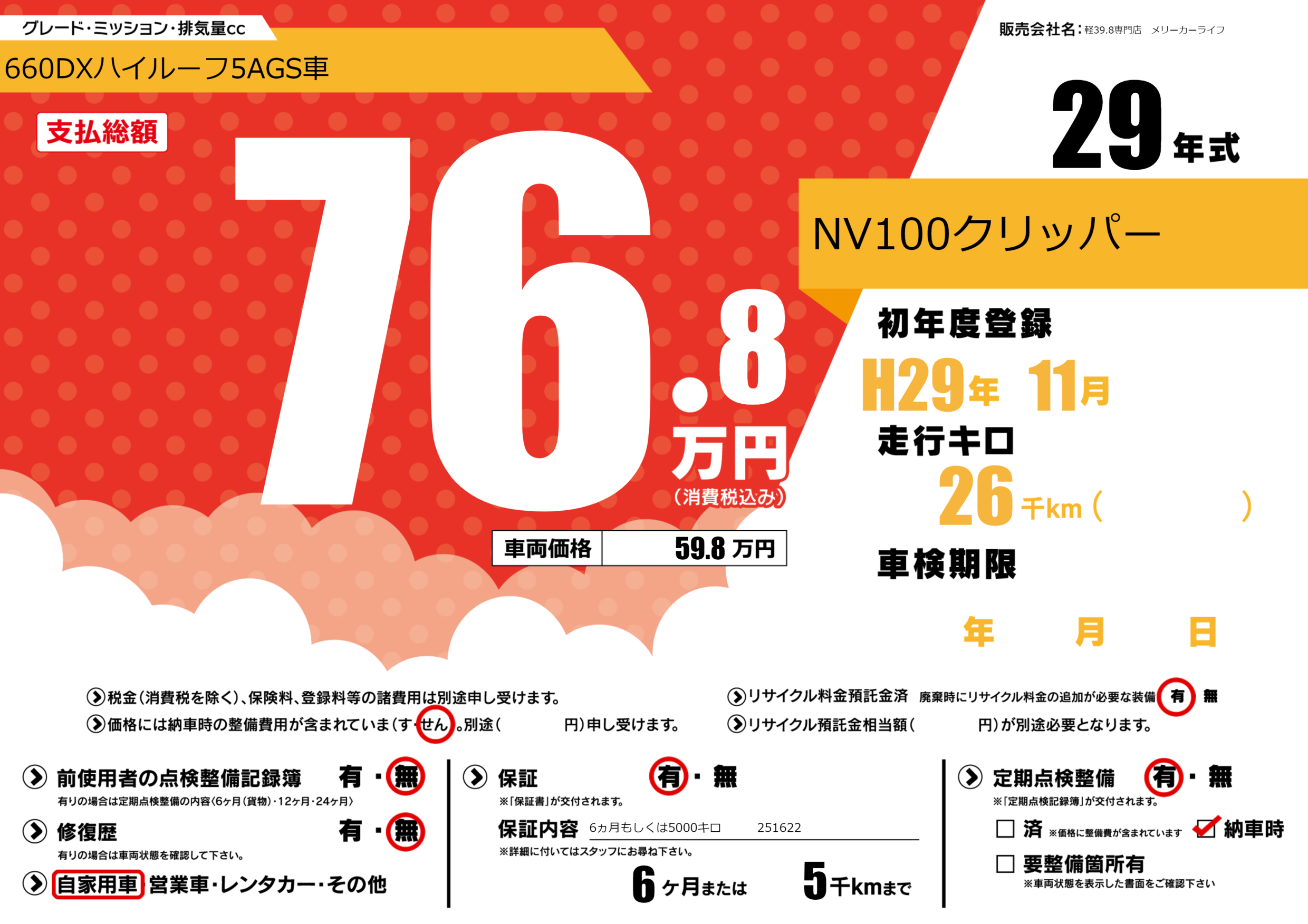 | 定期点検整備 | 定期点検整備あり 納車時あり | ||