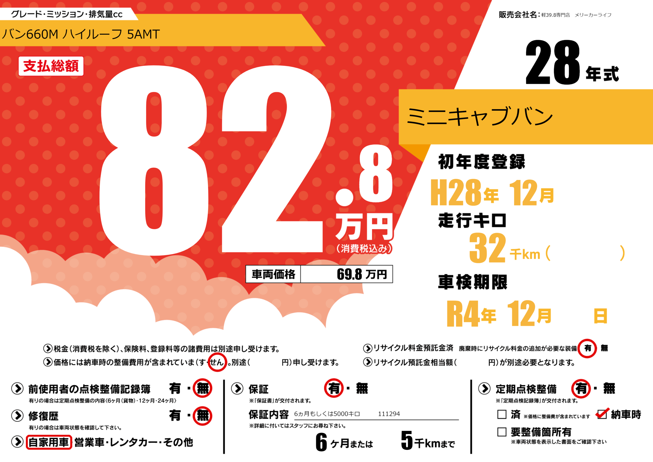 | 定期点検整備 | 定期点検整備あり 納車時あり | ||