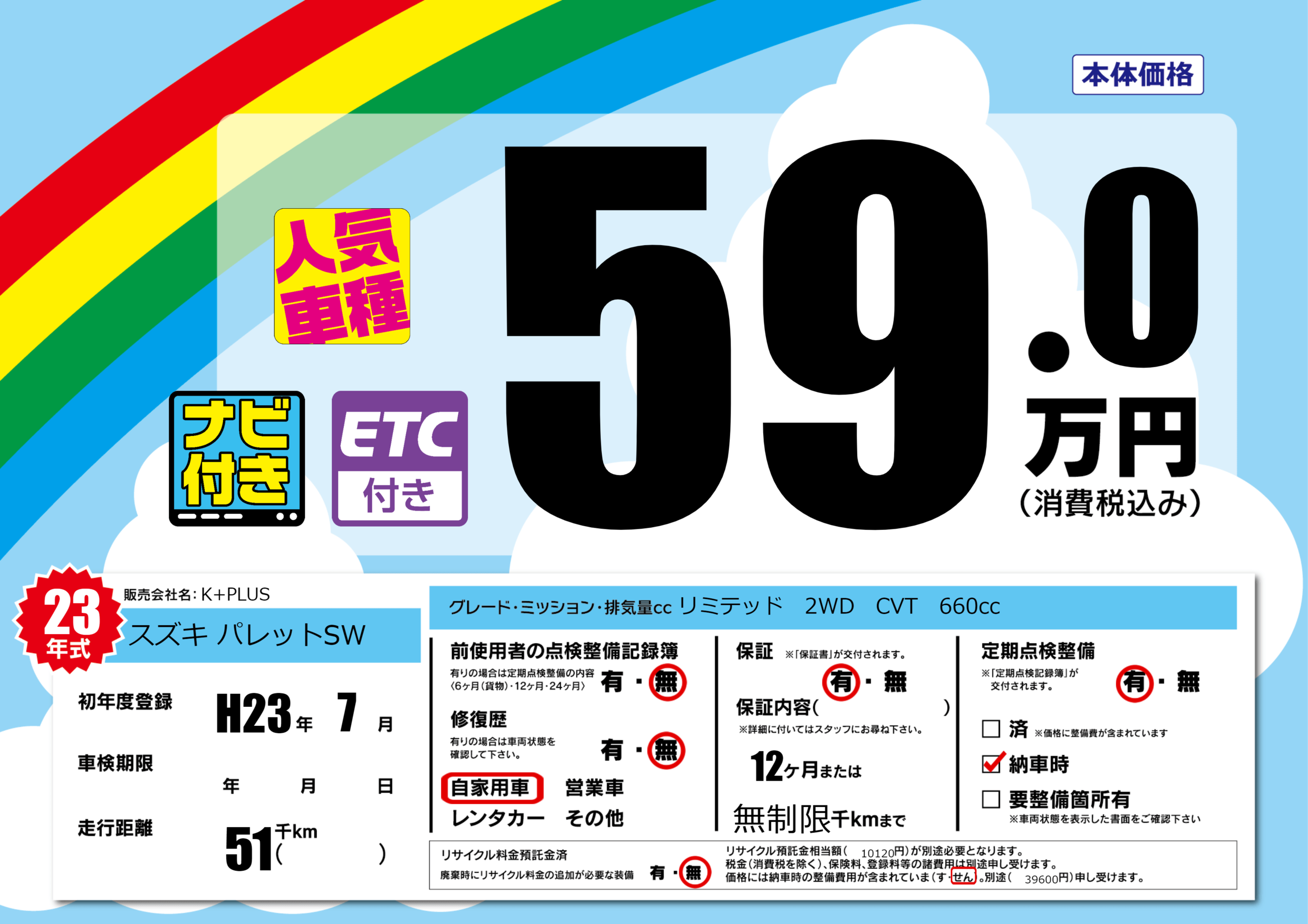 | 車名 | スズキ パレットSW | グレード ミッション 排気量 |