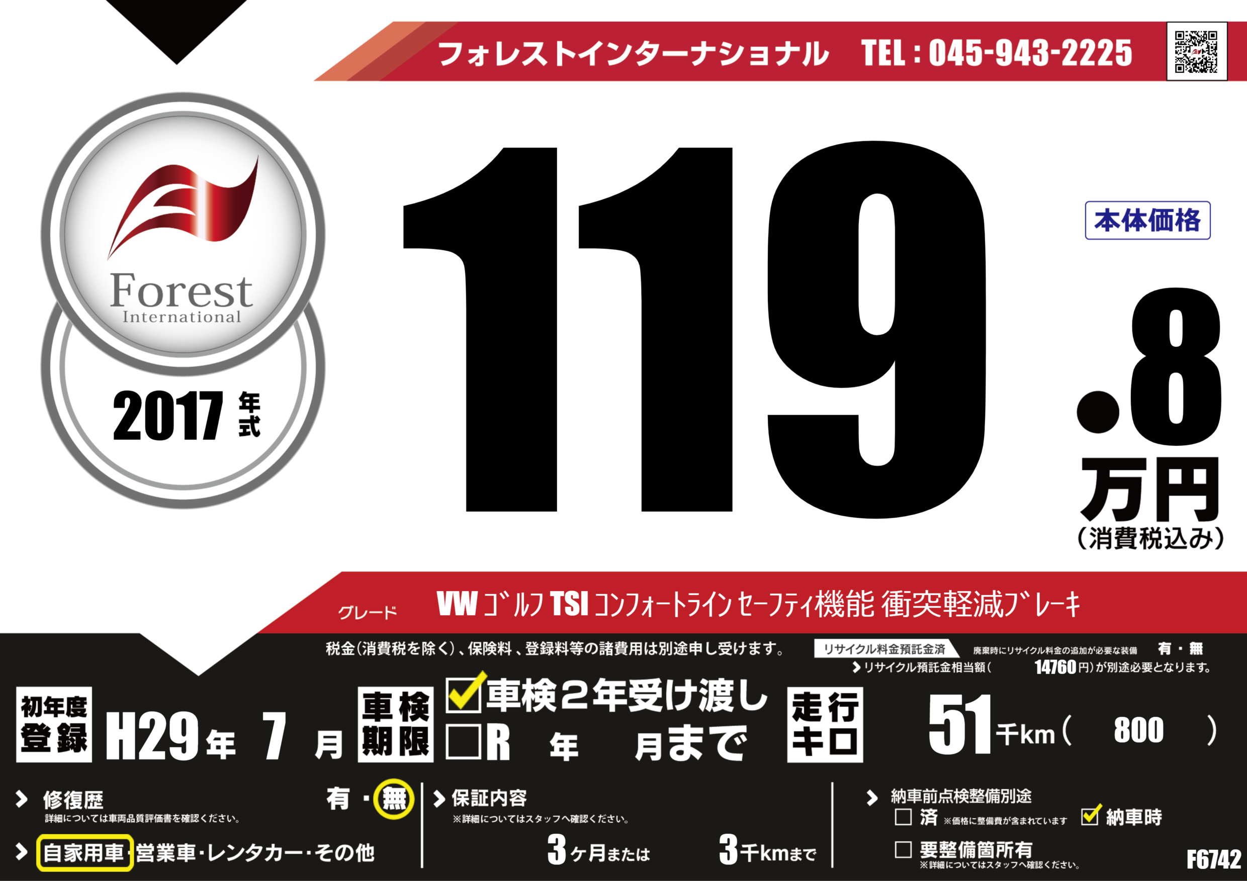 | 走行キロ | 5.1万km | 初年度登録 | H29年7月 |