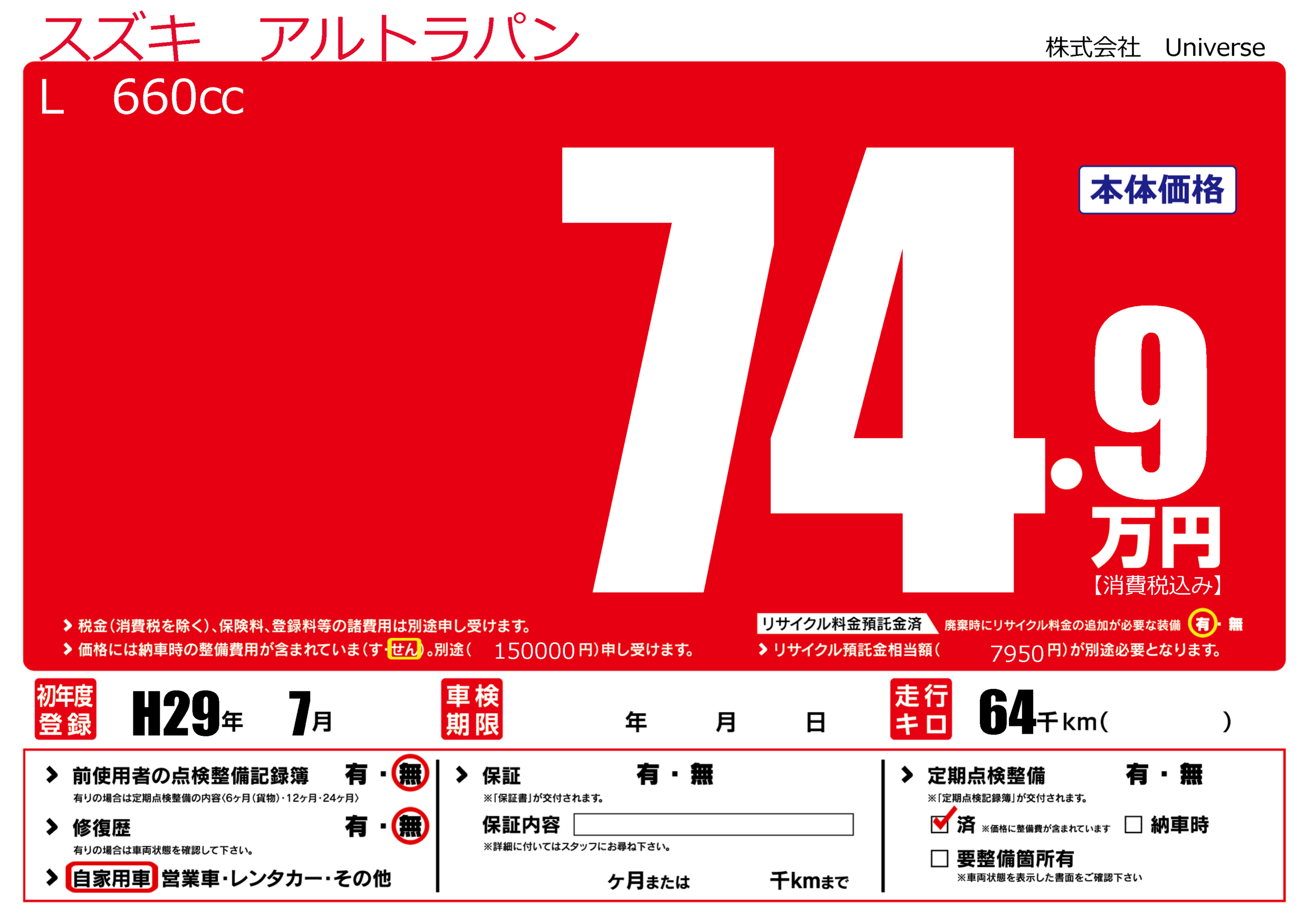| 走行キロ | 6.4万km | 初年度登録 | H29年7月 |