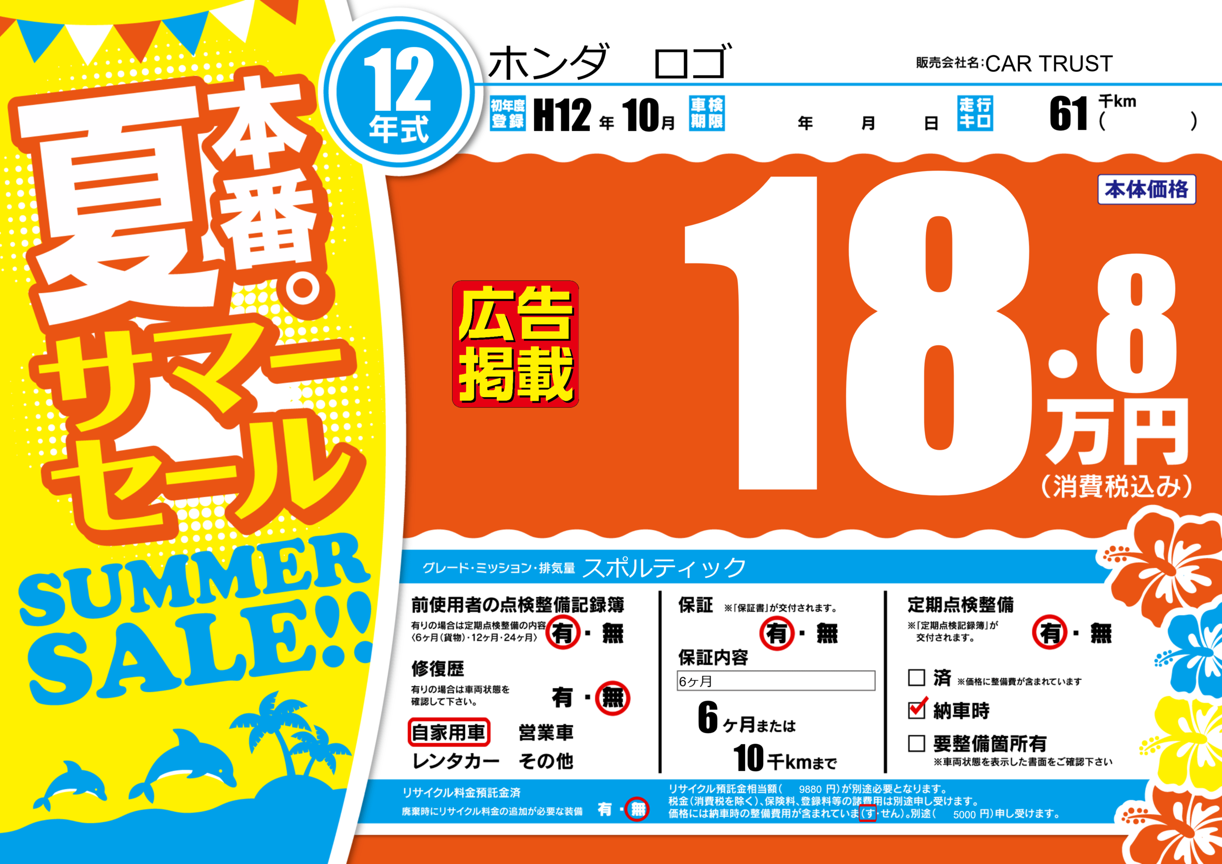 | 走行キロ | 6.1万km | 初年度登録 | H12年10月 |