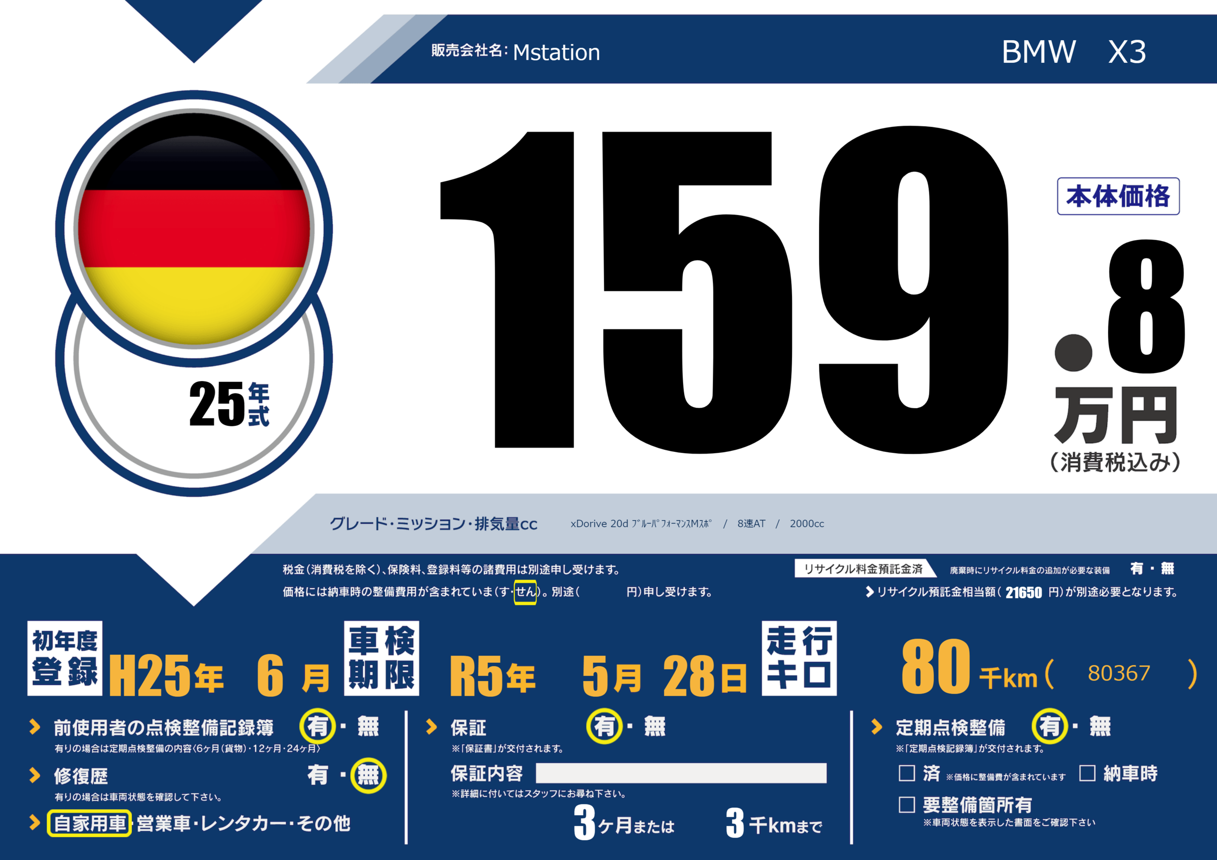 | 車名 | BMW X3 | グレード ミッション 排気量 |
